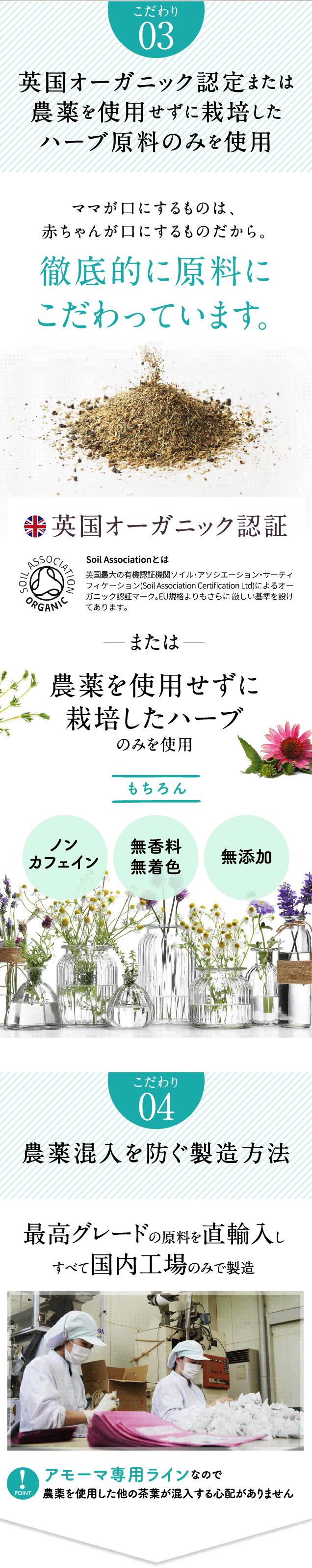 英国オーガニック認証または農薬を使わずに栽培したハーブ原料を使用し、JAS有機認定を受けた日本国内工場で製造しています。