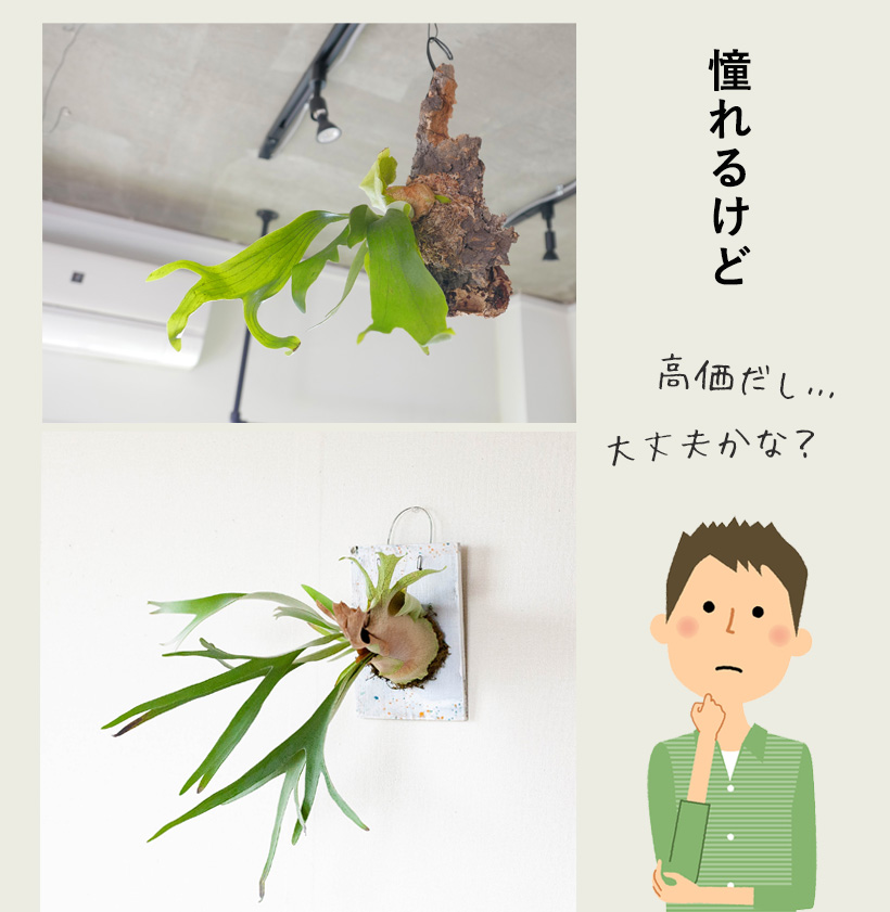 ただコウモリランは品種が多く、難しい品種もいくつかあります。そのうえ、板付けタイプは値段も高い。憧れはあるけど敷居が高い……そんなイメージ。