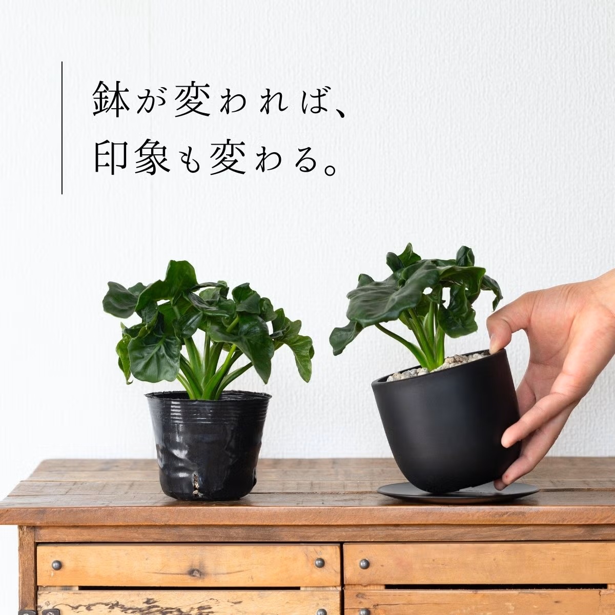 マットブラックの、樹脂製鉢です(受皿付き)。普通のプラ鉢に比べ、鉢壁が厚く形が良いので風合いが出ます。