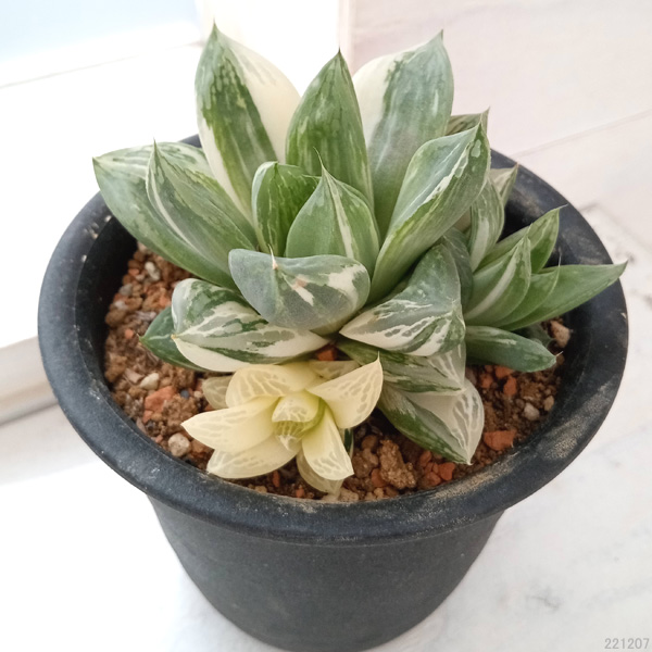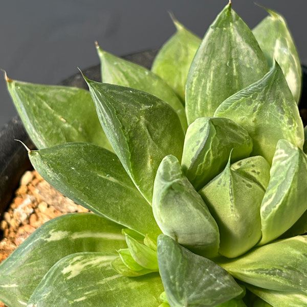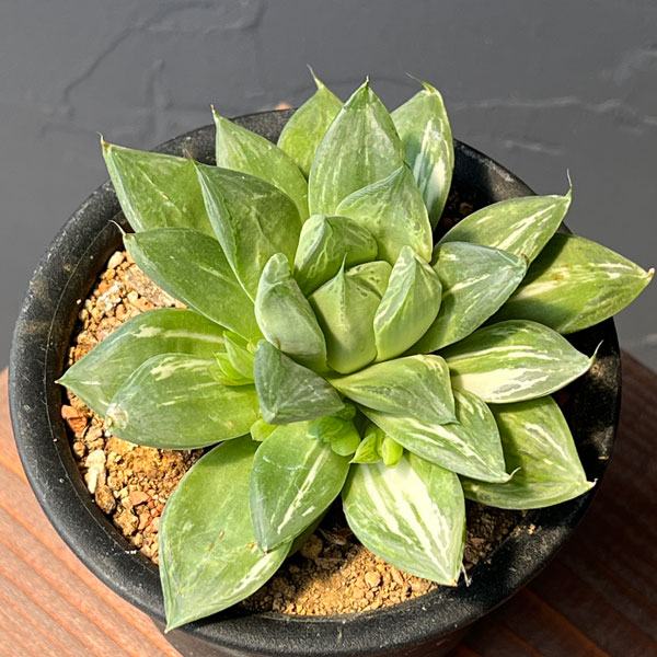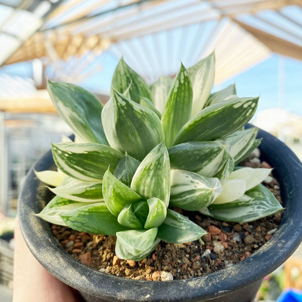 ★入荷から日数が経ったためセール価格となりました。商品の状態は画像と異なる場合があります。★白斑がきれいに入った ハオルチア 宝島 です。愛知の生産者さんが丹精に育てた逸品です。ハオルチアはぷにぷにとした姿のかわいい多肉植物。南アフリカのケープ地方などに自生する多肉植物の仲間です。多肉植物の中では最も小型で強健な種が多いのが特徴です。色や形は多種多様ですが、いずれの品種も乾燥に強く、耐陰性もあるので、室内での栽培にも向いています。