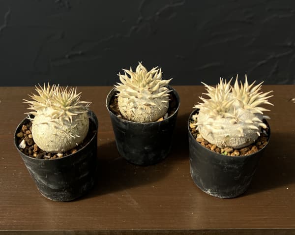 ぷっくりかわいいパキポディウムエニグマチカ実生株です。近年新たに発見されたパキポディウム エニグマチカはパキポディウムの中でも大きめの黄色い花が咲く品種です。初めて発見されてから生育地が見つかるまでかなりの時間と苦労を積み重ねて解き明かされたため「エニグマチカム(謎めいた)」という名前が付けられました。研究者の情熱があって、今日本で育てられていることを思うと、とても感慨深い一株です。