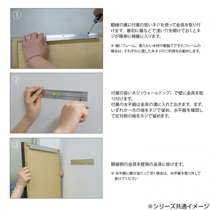 絵画やミラーを壁にぴったり、まっすぐに掛けることが出来る壁掛け用金具です。化粧ボード、合板、コンクリート、グラウト詰め、煉瓦、漆喰など様々な素材の壁及び中空壁に取り付け可能なネジ「ウォールドッグ」が付属しています。幅12mm以上の木製の額縁に対応しています。取り付けた状態での壁と額縁との空間は、約8mmで、横から見た時にもすっきりとスマートです。コンクリートや煉瓦については下穴が必要です。