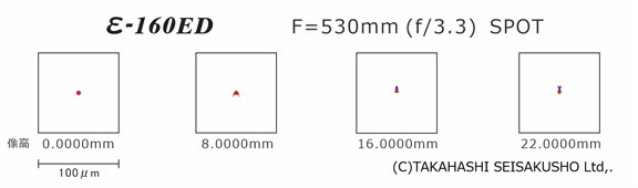 フルサイズ最周辺まで極めて良好な結像性能を維持しています。以前のε-160にデジタル補正レンズを組み込んだ状態と比べてスポット径は約1/5となり、比類なき高性能な光学系を実現しました。