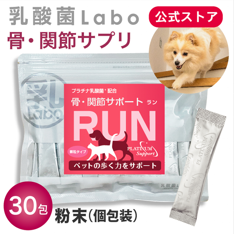 プラチナ乳酸菌RUN(ラン)は、関節の健康をサポートする グルコサミン コンドロイチンに加えて、骨の健康維持に役立つプロテタイトを配合しました。さらに、乳酸菌配合で健康UP!犬、猫にも与えやすい粉末タイプですので、食事の味を変えることなく与えることができます。