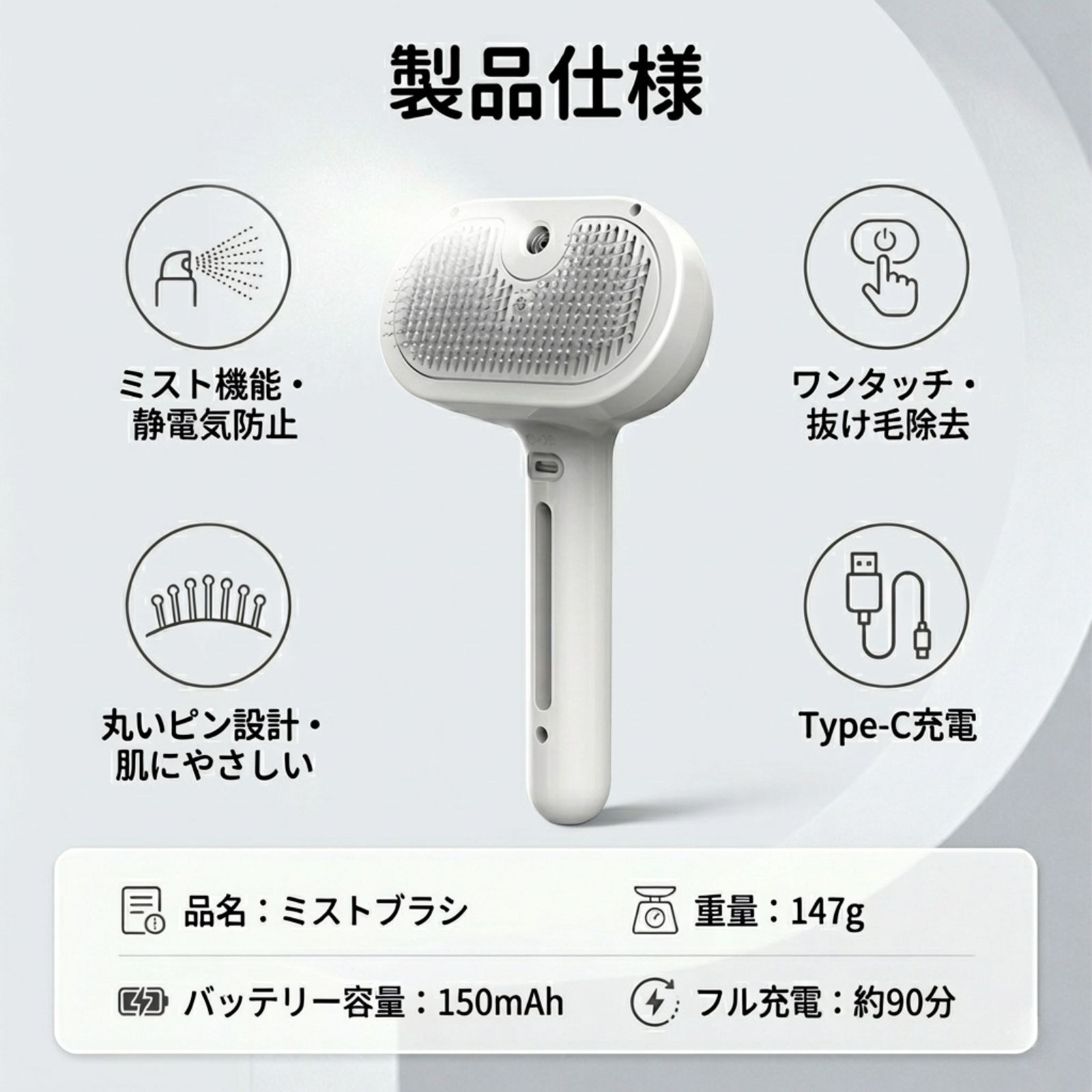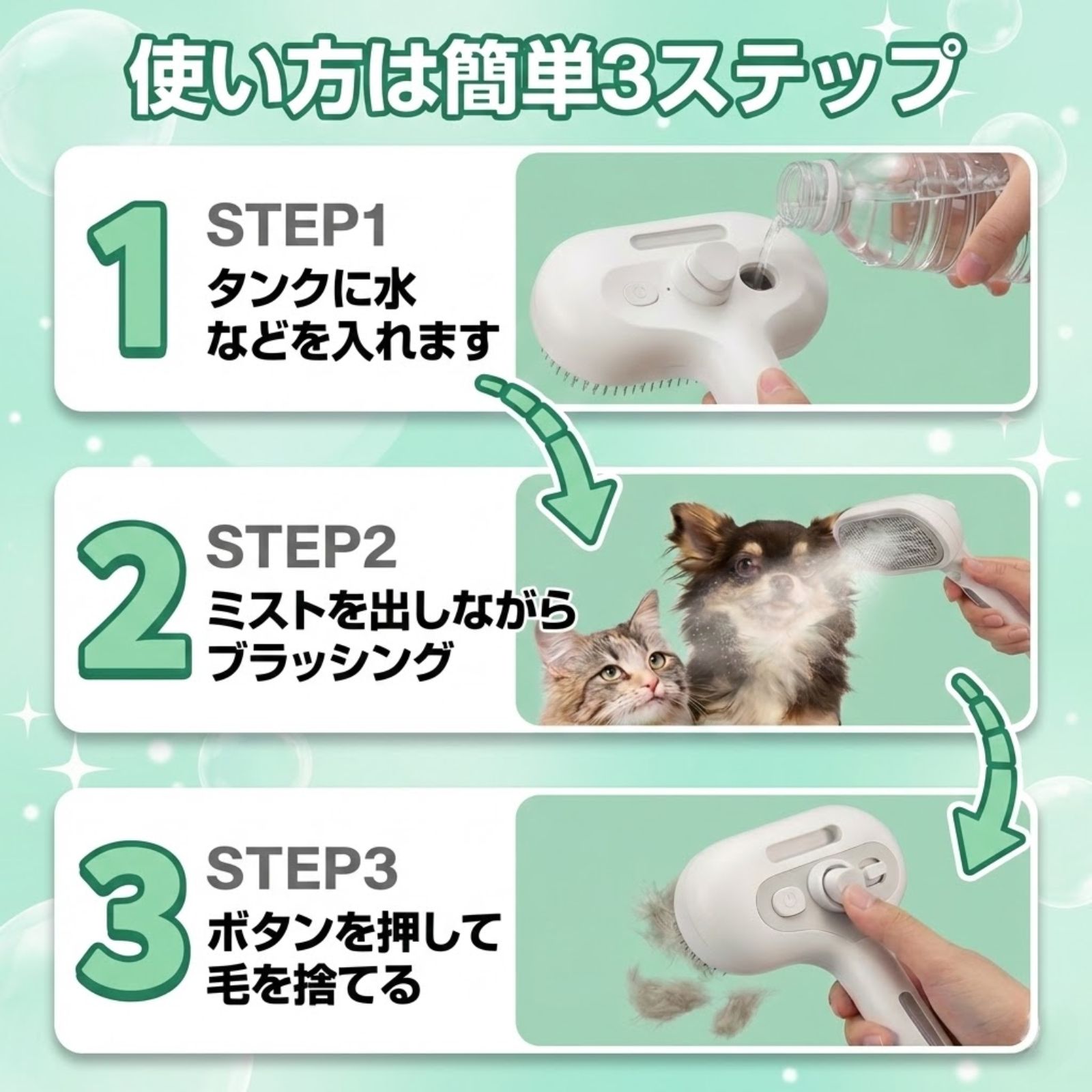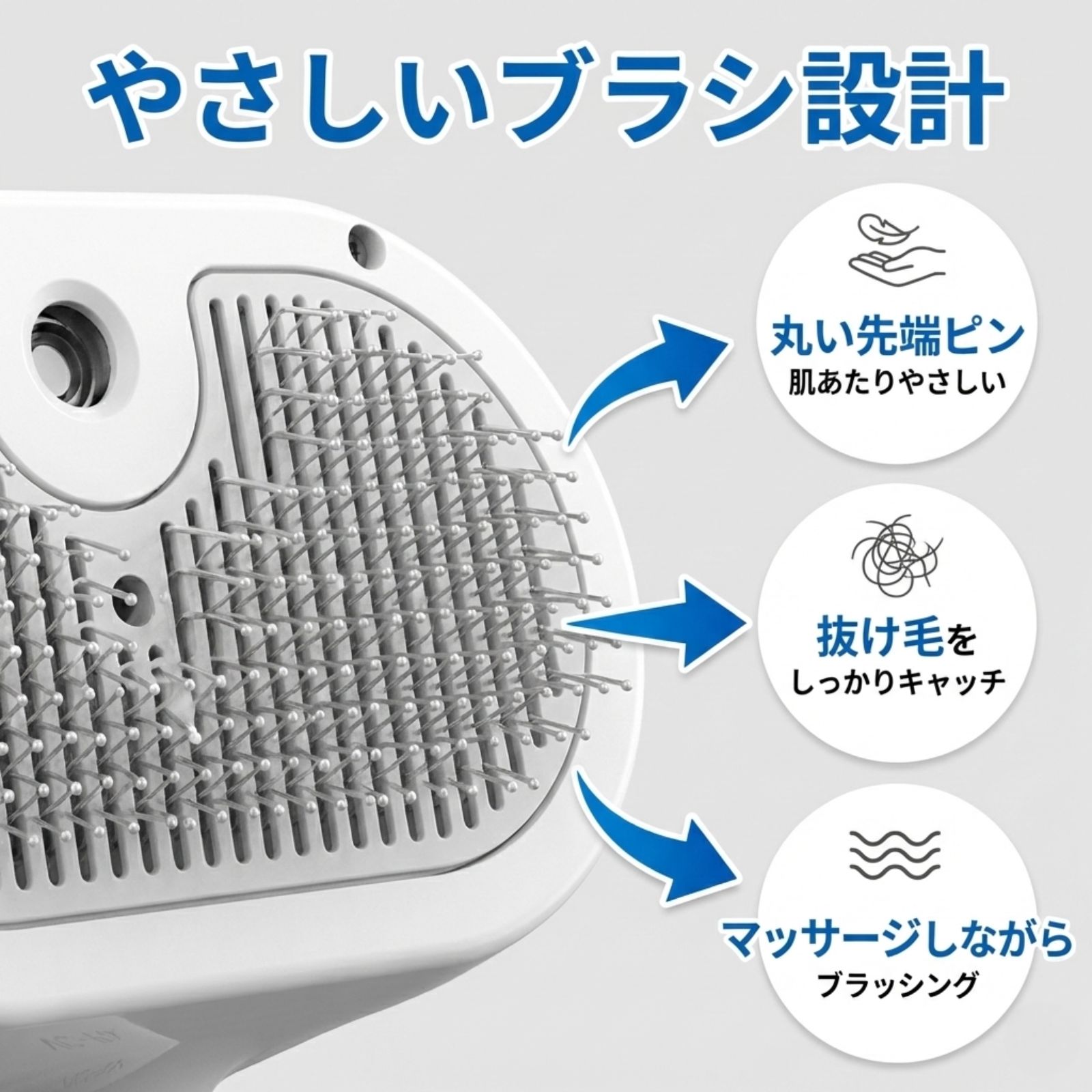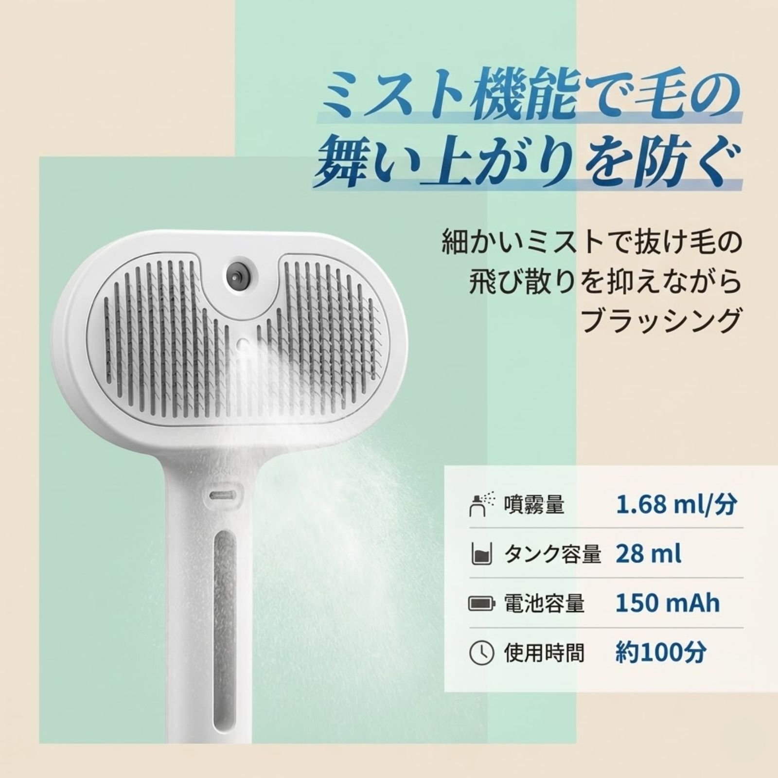 ・ミスト機能:細かいミストを放出しながらブラッシングすることで、お部屋に毛が飛散するのを徹底ガード。静電気も抑えます。
