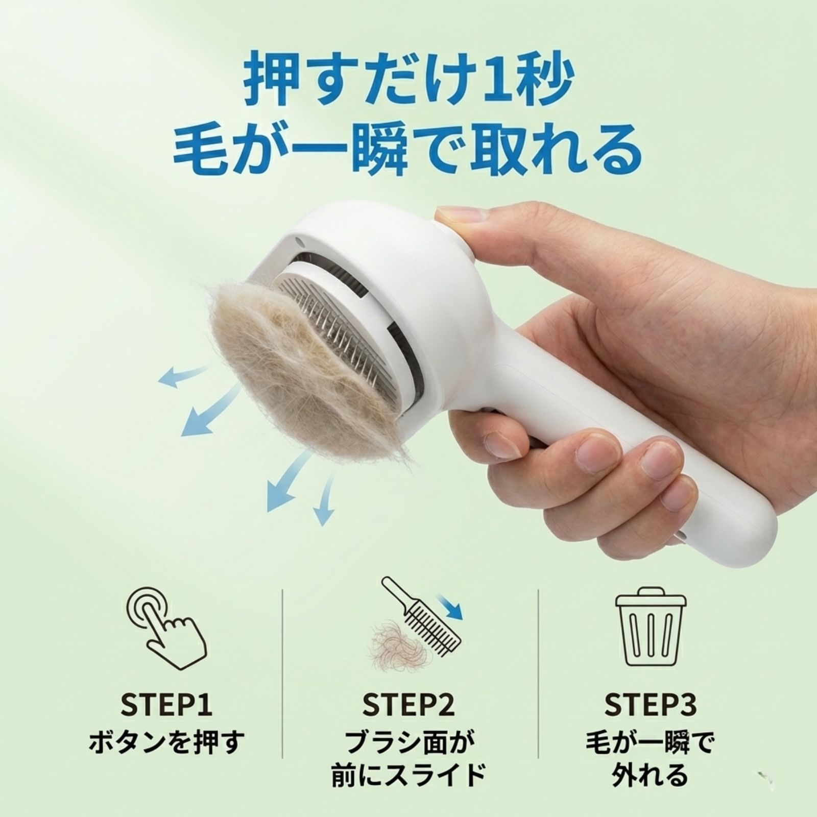・ワンタッチ毛捨て:背面のボタンをプッシュするだけで、溜まった抜け毛が一瞬で外れます。お手入れの手間を大幅に軽減します。