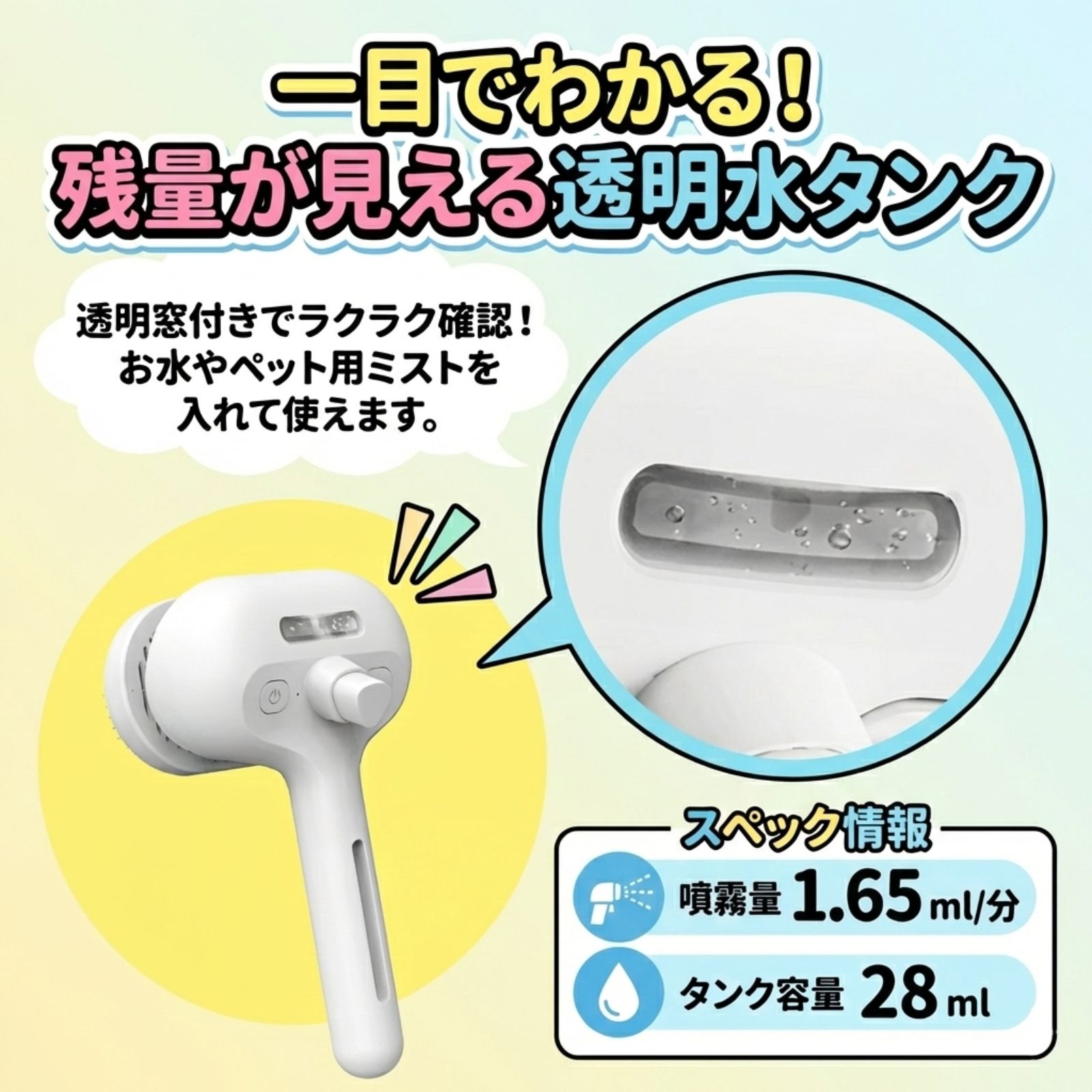 透明窓付きタンクで、お水やミストの残量も一目でわかります。