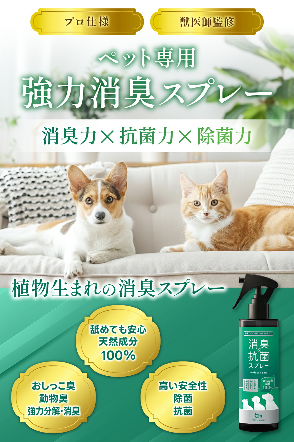 ペットリンクモア公式 犬 猫 消臭 & 抗菌 スプレー 300ml 天然成分100% 日本製 ペットリンクモア お手入れ 犬用 猫用 消臭スプレー 抗菌スプレー におい 除菌