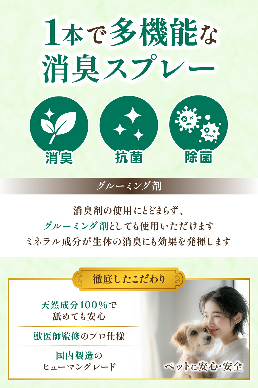 天然成分100%の消臭スプレーで舐めても安心。植物性抽出液と天然ミネラルで精製しており、人工的な香りで誤魔化しません。