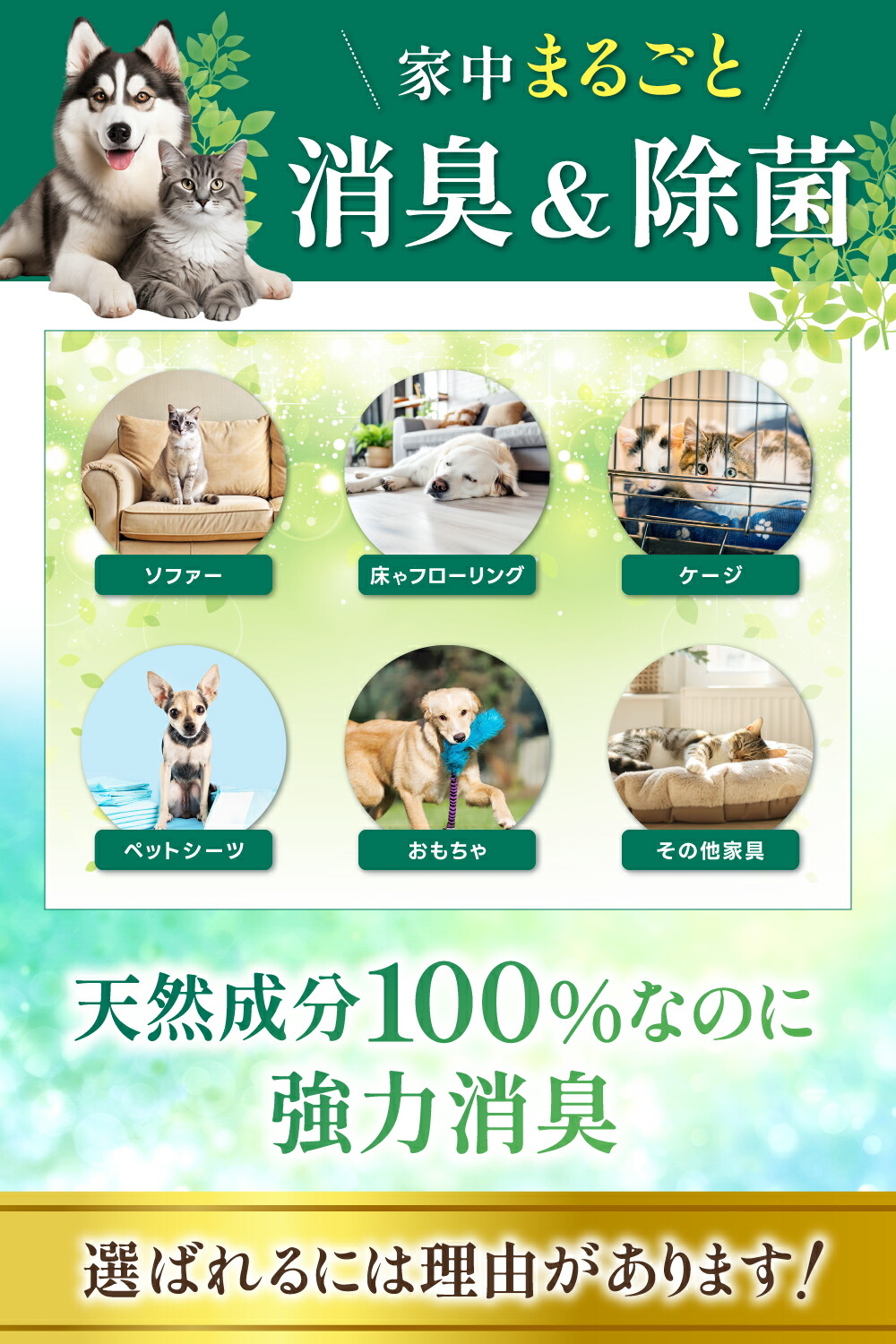 1本で消臭、抗菌、除菌ができる優れもので、床やソファ、おもちゃ、トイレ周りなど、場所を選ばずに使えて、清潔で快適な毎日をサポートします。