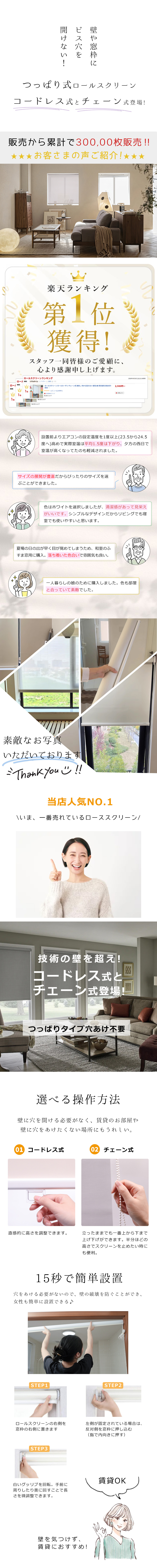 【コードレス式ロールスクリー】コードがなく、スクリーンを任意の位置で止めることができ、直接スクリーンを手で操作するだけです。これにより、操作が非常に簡単で、子供や高齢者でも簡単に扱うことができます。【チェーン式ロールスクリーン】チェーン式のロールスクリーンは、操作が簡単で使いやすいことです。チェーンを引くことでスクリーンを簡単に上げ下げできるため、光やプライバシーを素早く調節することができます。これにより、快適な環境を維持することができます。また、メカニズムがシンプルで頑丈なので、耐久性があり、長期間使用することができます。