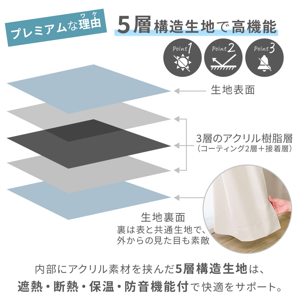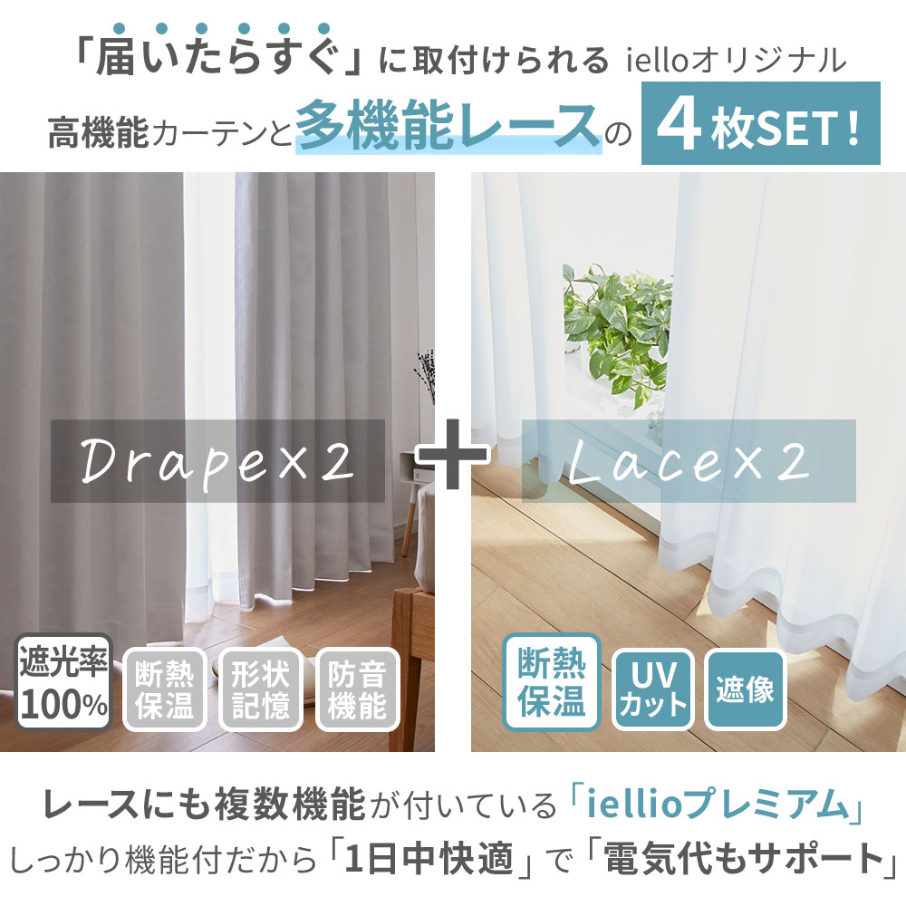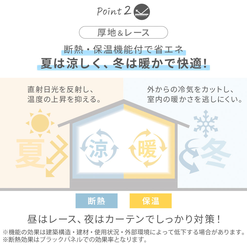 ■機能/ドレープ(厚地):断熱効果・保温効果・1級遮光(実測遮光率100.00%)・防音加工・形状記憶加工、レース:断熱効果・保温効果・UVカット・防視認性