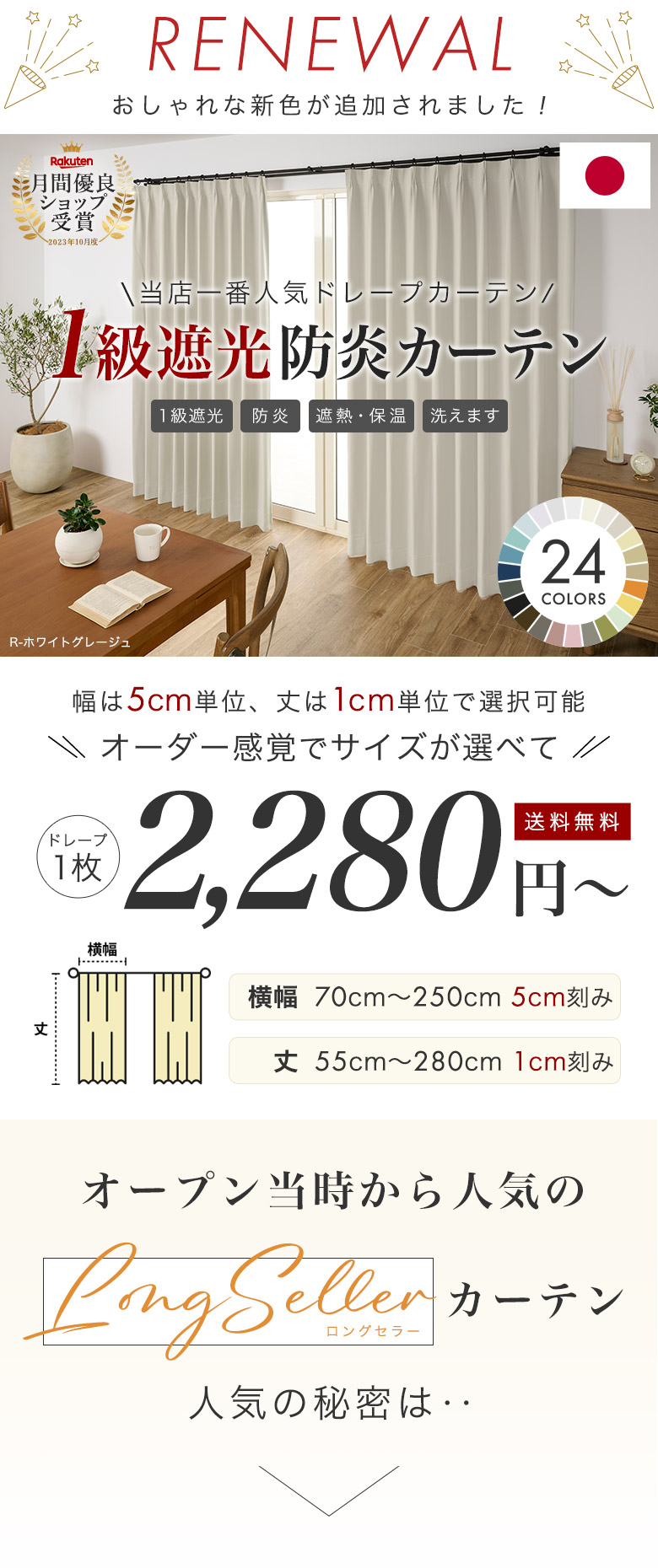 シンプルで飽きのこない色展開、光をしっかり遮る1級遮光に防炎加工も施した吊るすシーンを選ばない万能カーテン。