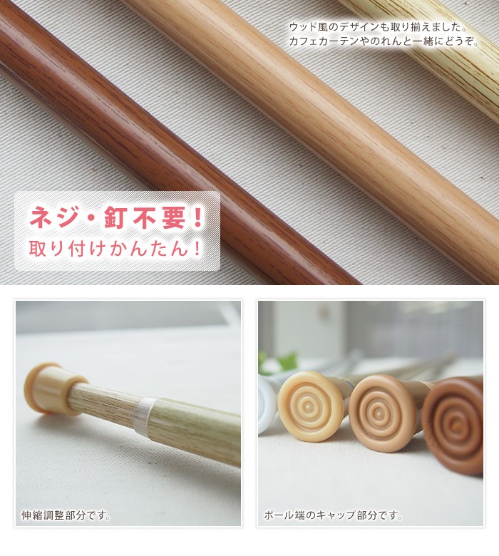 ネジや釘が不要で取り付け簡単・伸縮自在のフリーテンションポール*ウッド風のデザインも取り揃えました!錆びにくいので湿気の多いお風呂などに使えます。