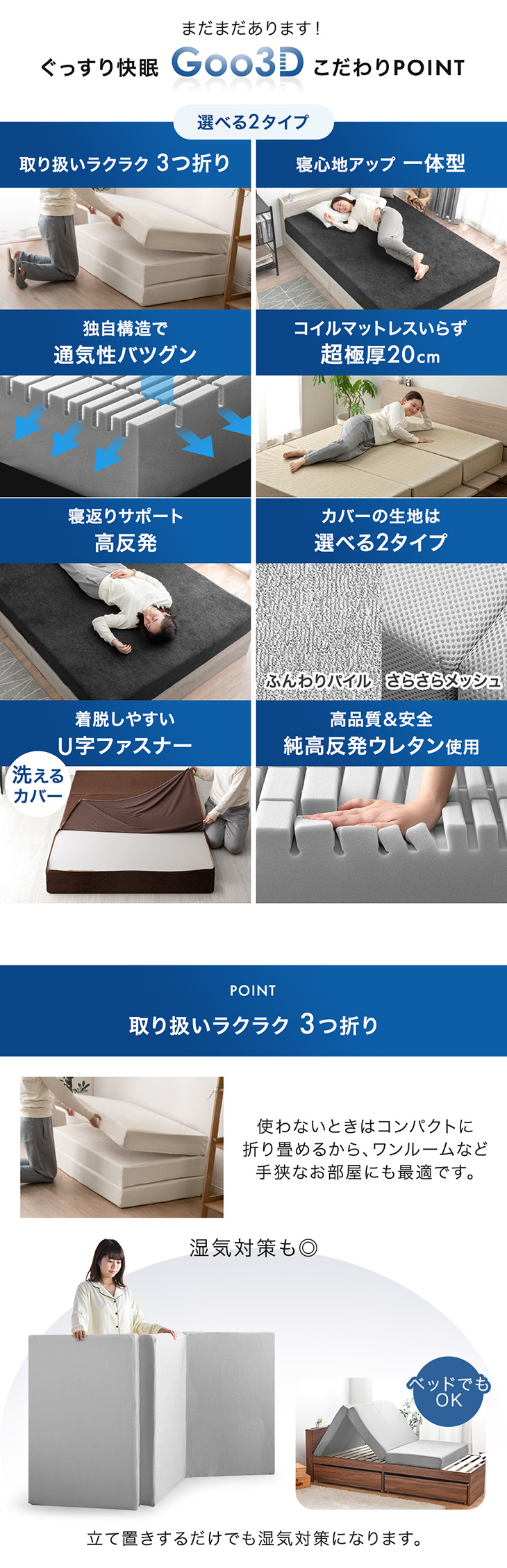 マットレス シングル 三つ折り 純高反発 一体型 折りたたみ