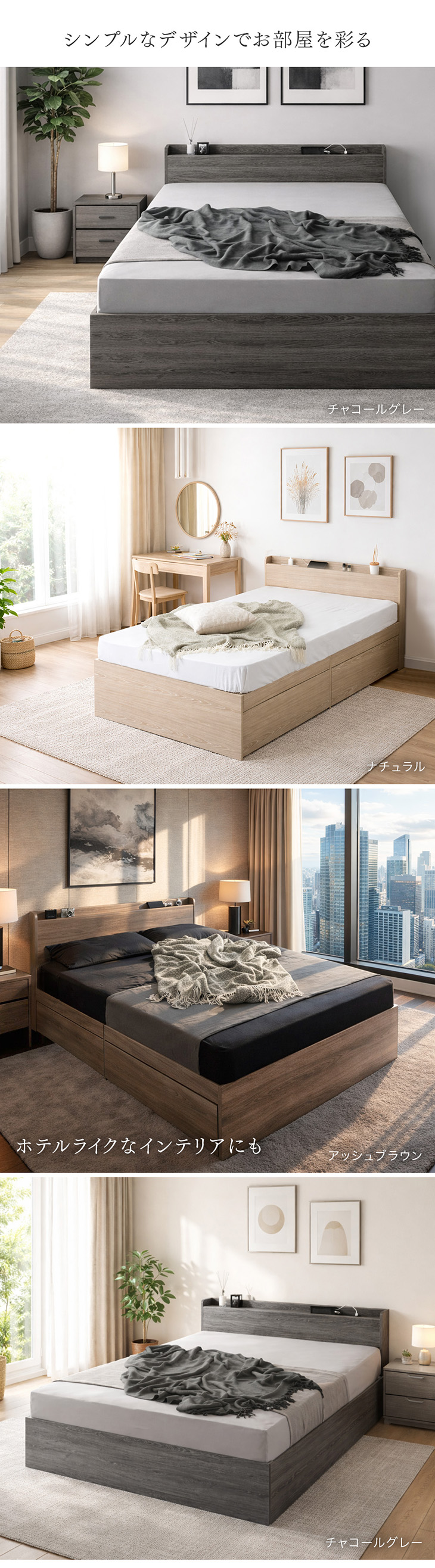 ナチュラル、ホワイトウォッシュ、アッシュブラウン、チャコールグレー