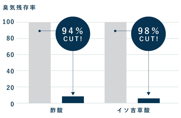 特に汗の臭いやタバコの臭いのもとである、酢酸*1やイソ吉草酸*2への高い消臭効果があり、第三者機関*3によっても実証されています。