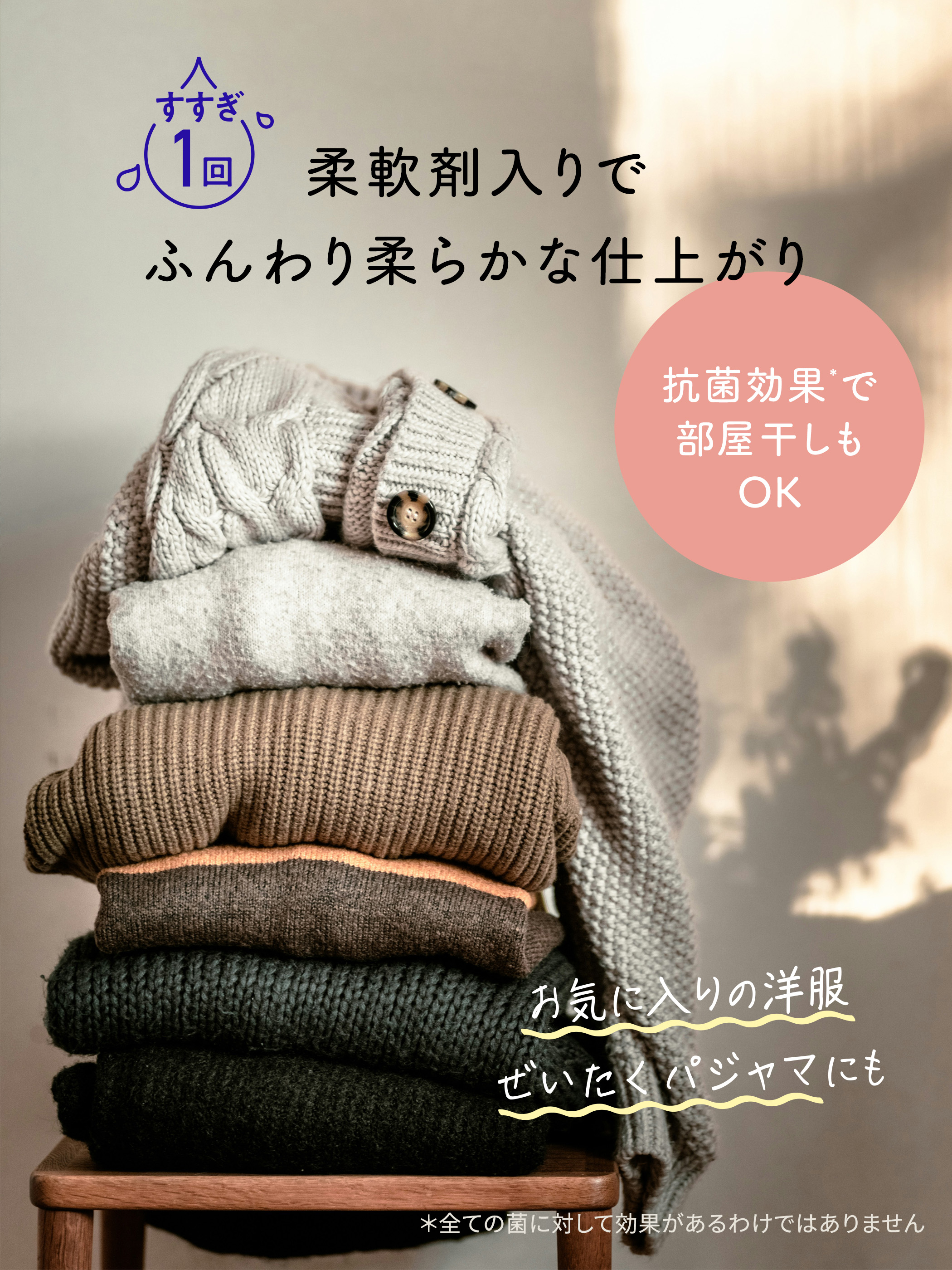 柔軟剤入りでやわらか仕上げ。洗たくダメージを防いでやさしく洗う、オシャレ着洗剤。