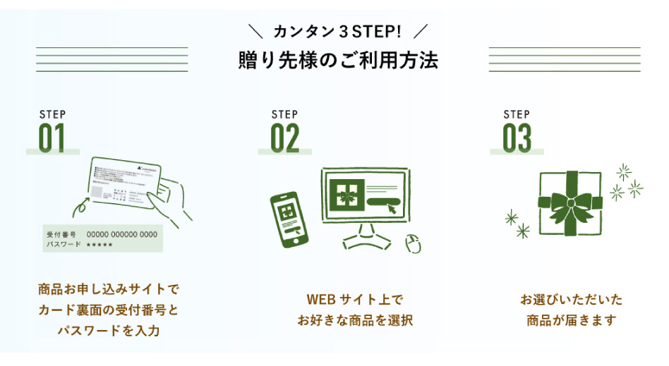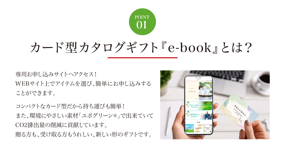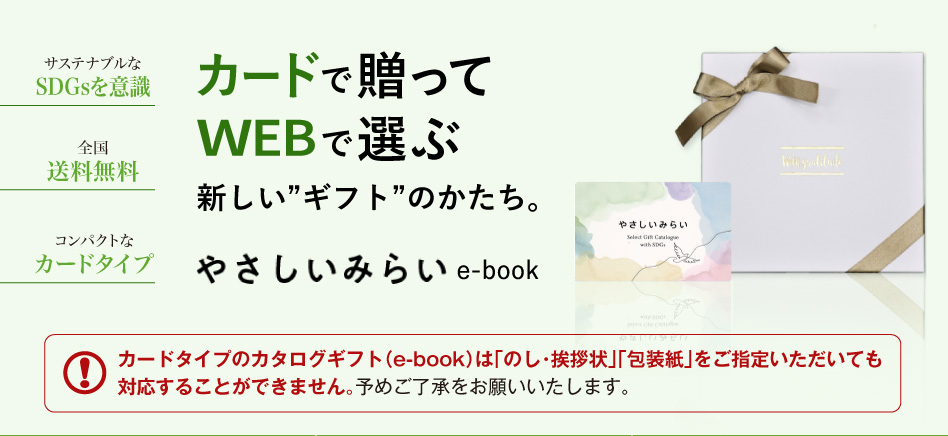 冊子タイプと同じアイテムをWEB上で選べるデジタル版カタログギフト「e-book(イーブック)」コンパクトなカード型だから持ち運びも簡単!贈る方も、受け取る方もうれしい、新しい形のギフトです。