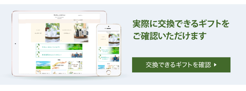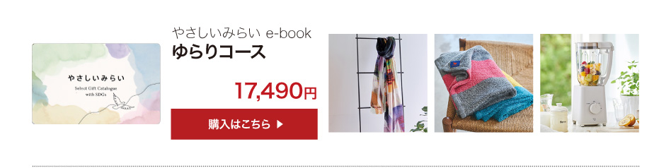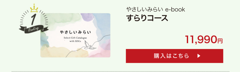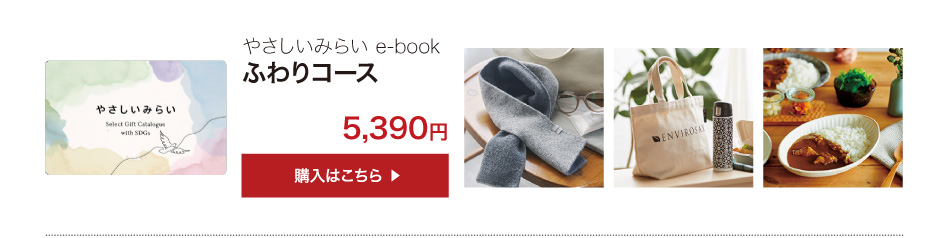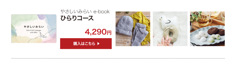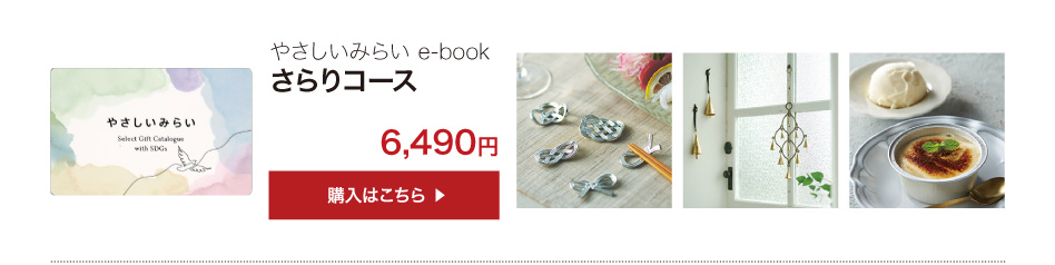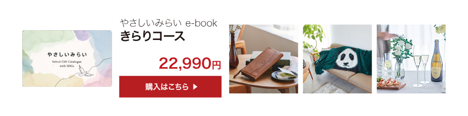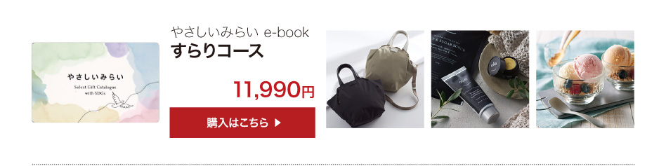 業界初!SDGsコンセプトのサステナブルなカタログギフト「やさしいみらい e-book(さらりコース)」のご紹介ページです。天然・無農薬の食品、コスメ、コットンなど、体と心にやさしいアイテム満載!結婚式でも大好評!