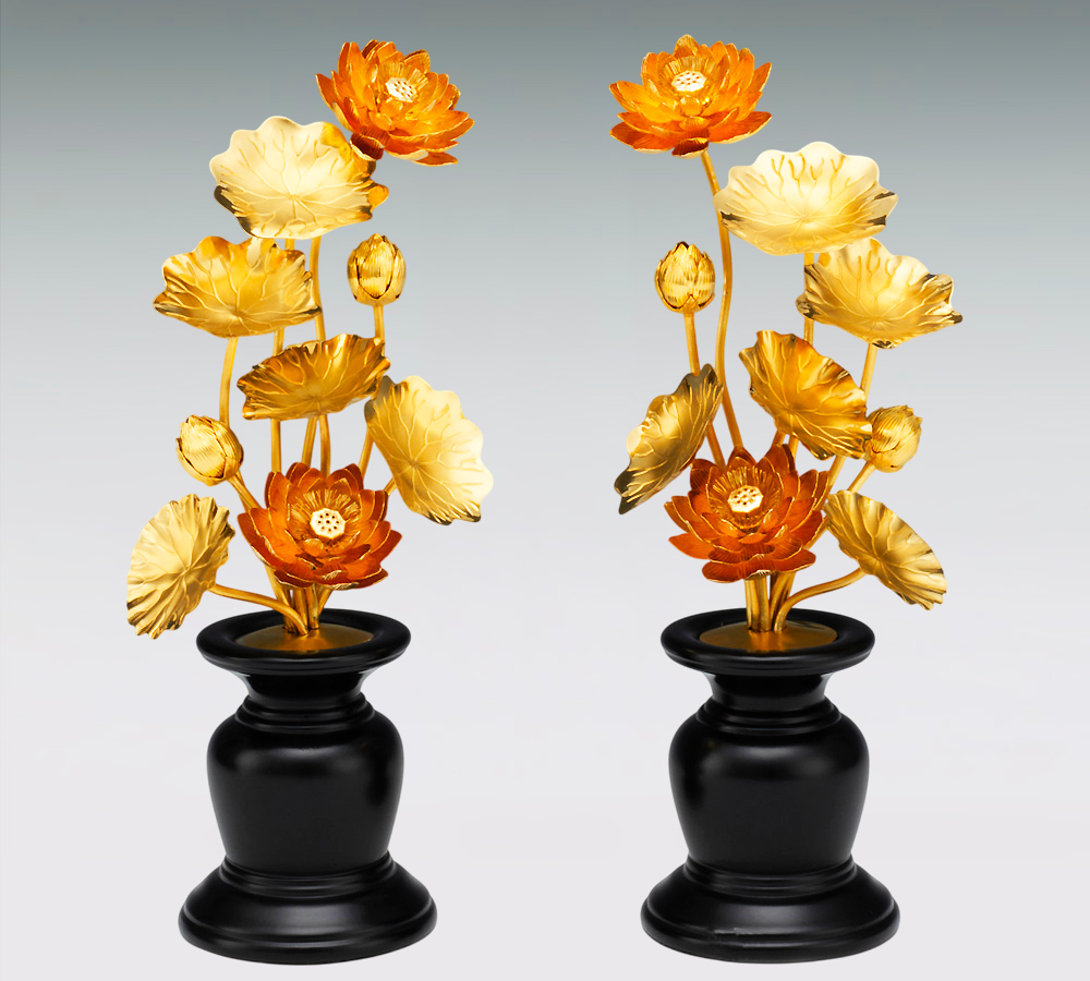 本品は、蓮の花や葉や茎を丹念に純金で作り込まれ、心安らぐ美しさを放つ逸品です。