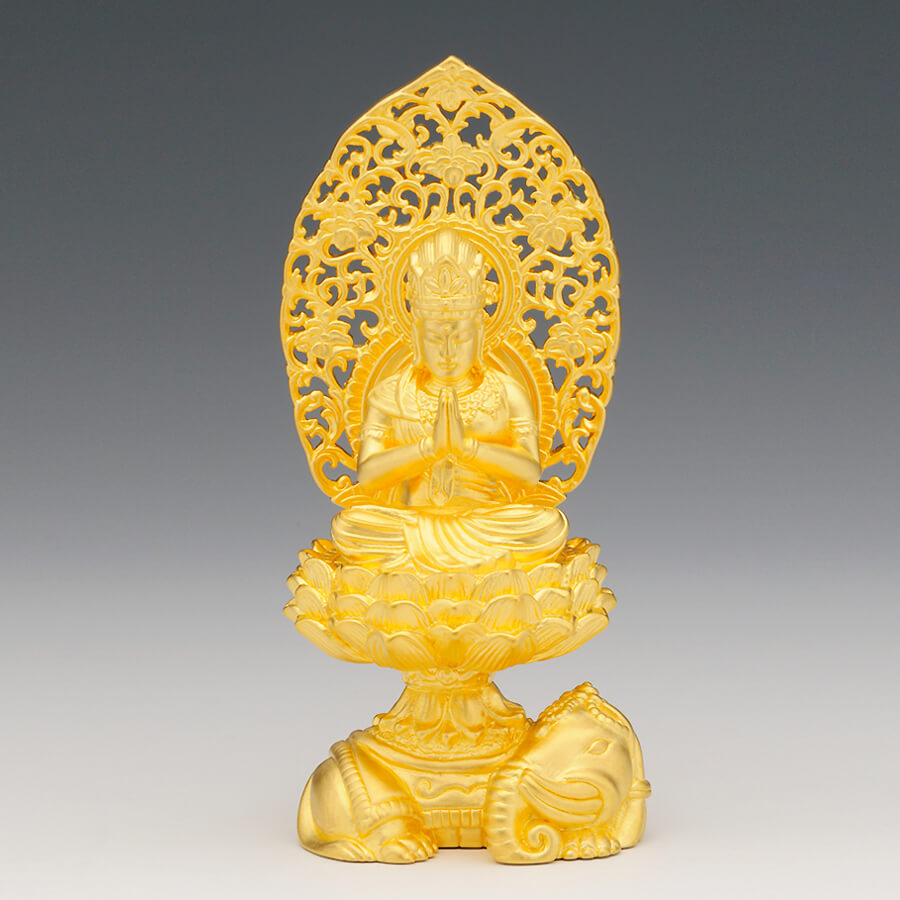重厚な蓮華座(れんげざ)を乗せた堂々たる六牙の白象に結跏趺坐(けっかふざ)して比類なき荘厳さを演出しています。