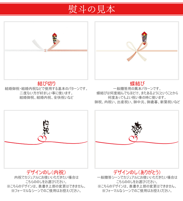 熨斗はフォーマルなシーンで使えるデザインのものから、カジュアルなシーンでお使いいただける可愛らしいデザインのものをご用意しております。