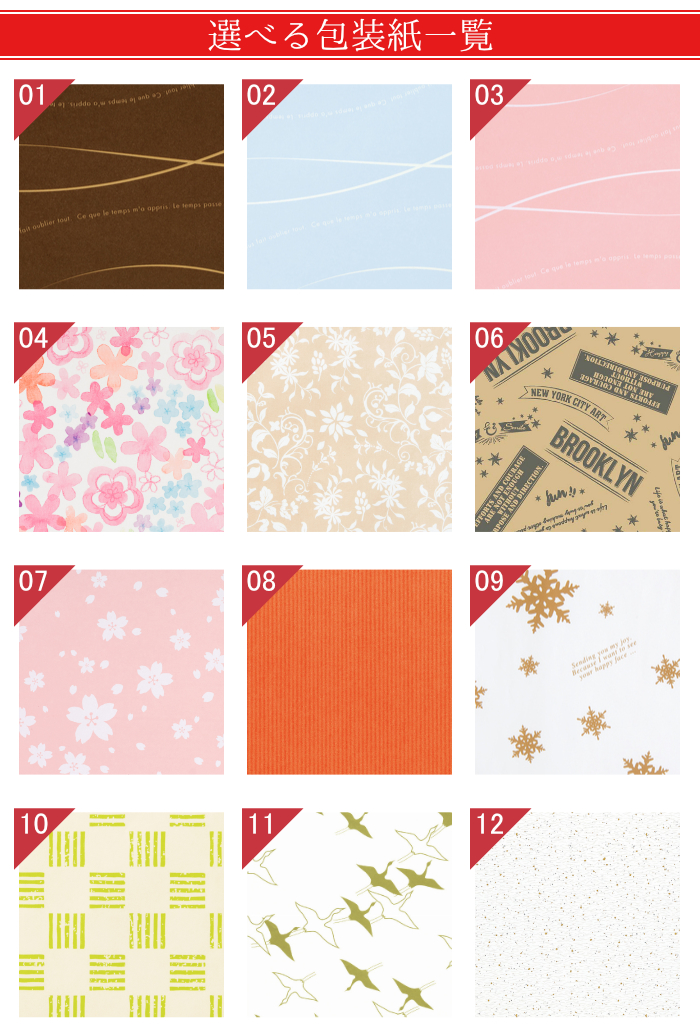 包装紙も使用シーンやお客様のお好みにあわせて、【全12種類】の中より、自由にお選びいただけます。