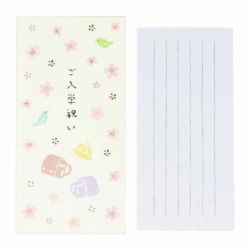 入学のお祝いを包むときに使用するのし袋です。桜やランドセルがほのぼの描かれています。手触り感のある伊予和紙の風合いが優しく、淡い春らしい色合いに金箔加工が入っている華やかな金封です。金封は封筒式で、メッセージを記入できる一筆箋付きです。お金は折らずにまっすぐ入れることができます。お金を入れる目安は5000円〜3万円です。