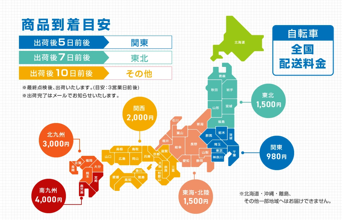 当店から配送業社へ持ち込みに1〜7営業日前後、配送業社からの配達は1〜10営業日前後で日時の指定はできません。問合せ番号が出ない仕組みにより、その分配送代を抑える形となります。