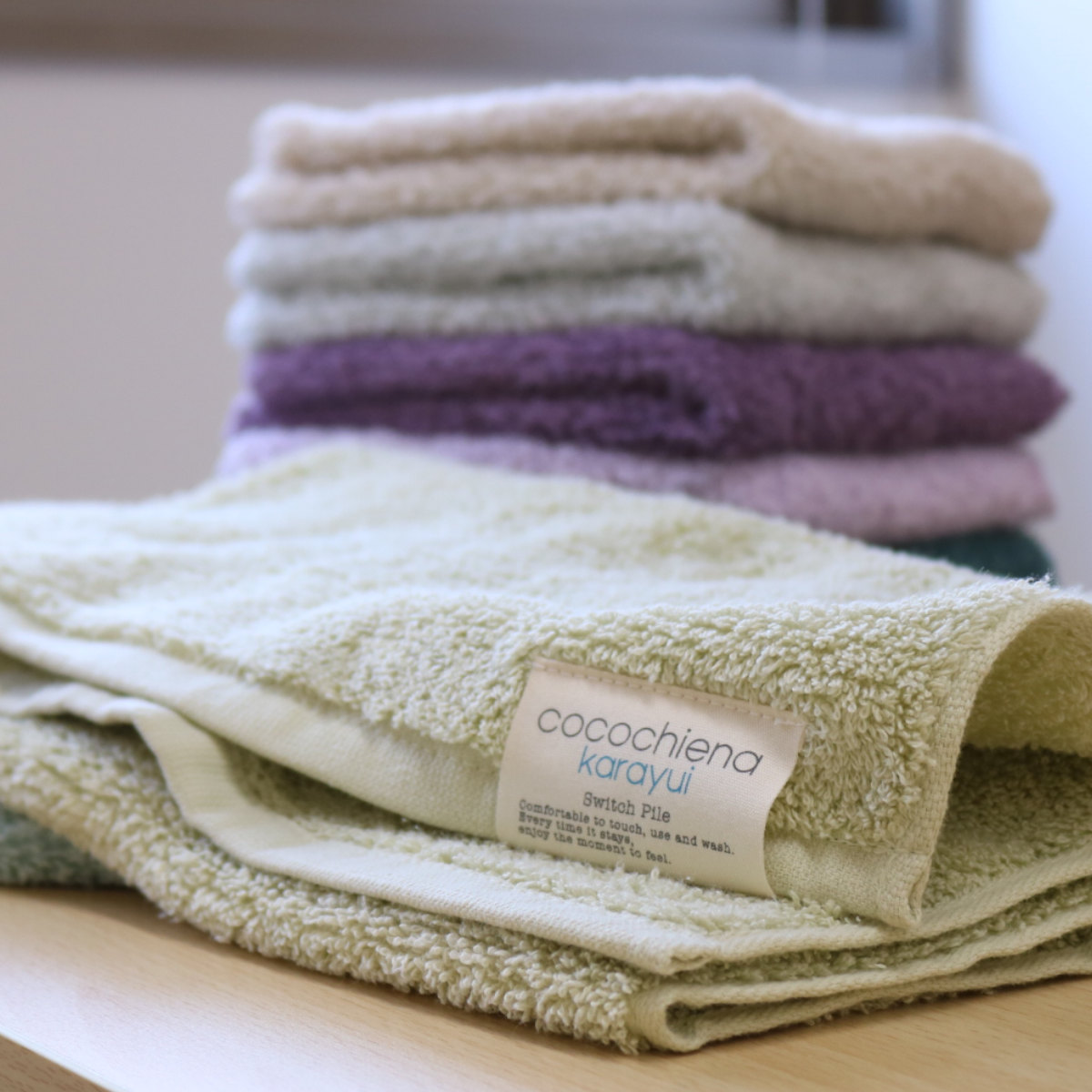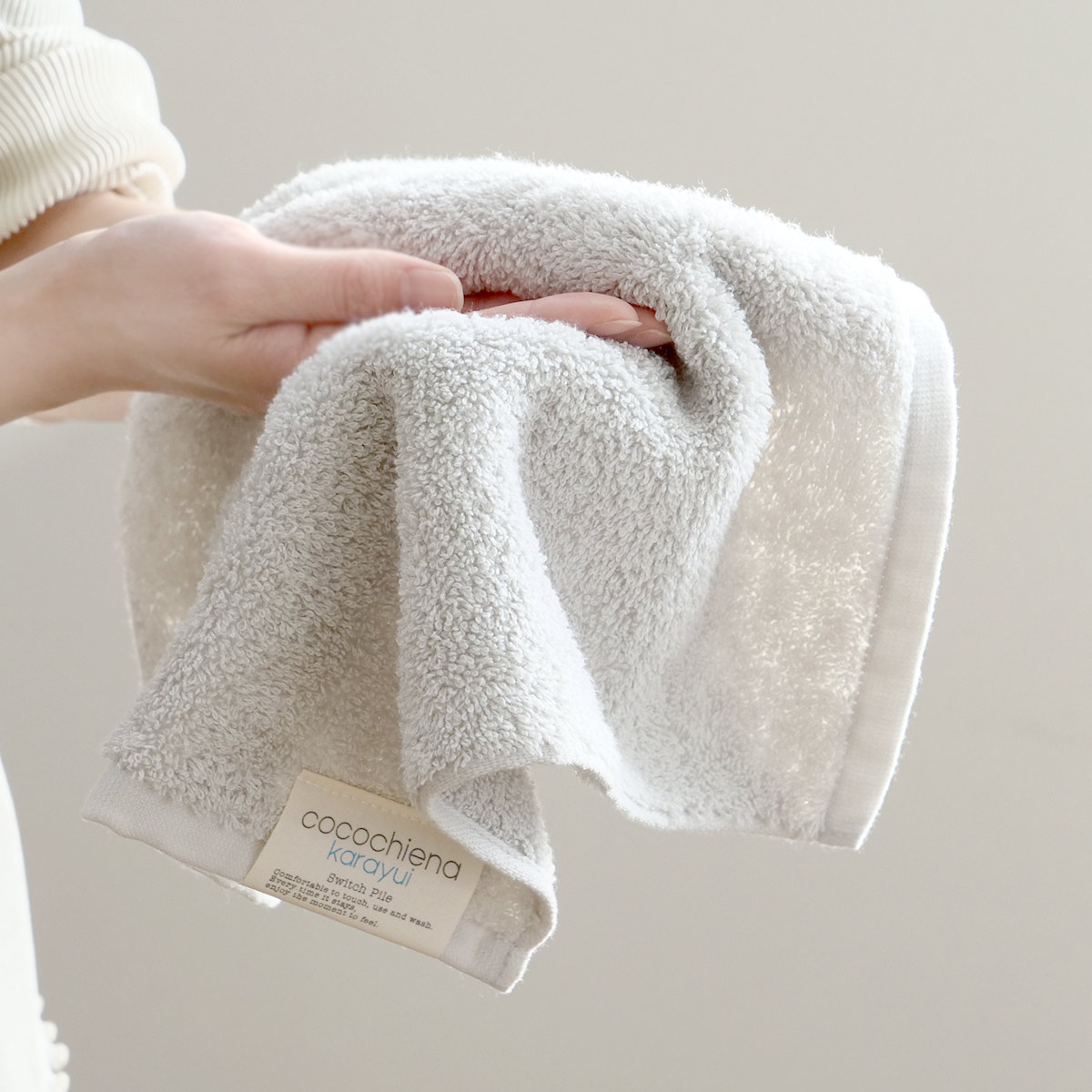 タオルのカラーに馴染む「cocochiena karayui」のおしゃれなタグが付いています。