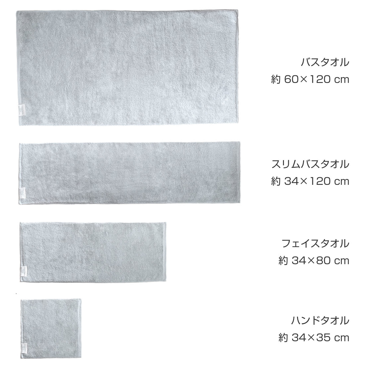 バスタオル、スリムバスタオル、フェイスタオル、ハンドタオルの4サイズをご用意しています。日常使いからお出かけ用まで様々なシーンに合わせてご使用頂けます。