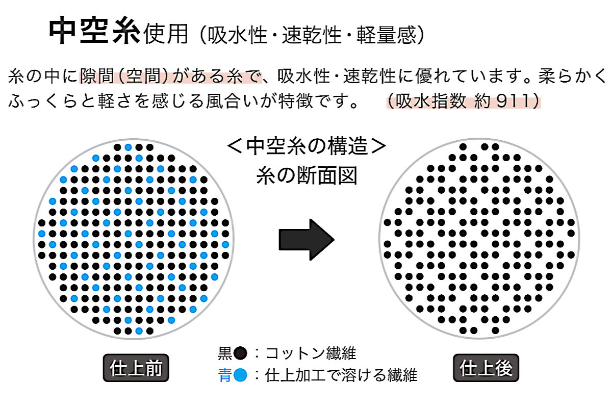 ボリュームがあるのに軽いハンドタオルです。糸の中に空間がある中空糸を用いることで空気を含み、驚きのボリュームと軽さを実現しました。吸水性の良さと見た目より軽く感じるのが特徴で、やさしく触れるだけで水分を吸水してくれます。