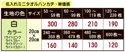 名入れミニタオルハンカチ/OPP袋入れ<120〜239枚ご注文時の単価><送料・型代込>タオルハンカチ/オリジナル/名入れタオル/タオルギフト/粗品タオル