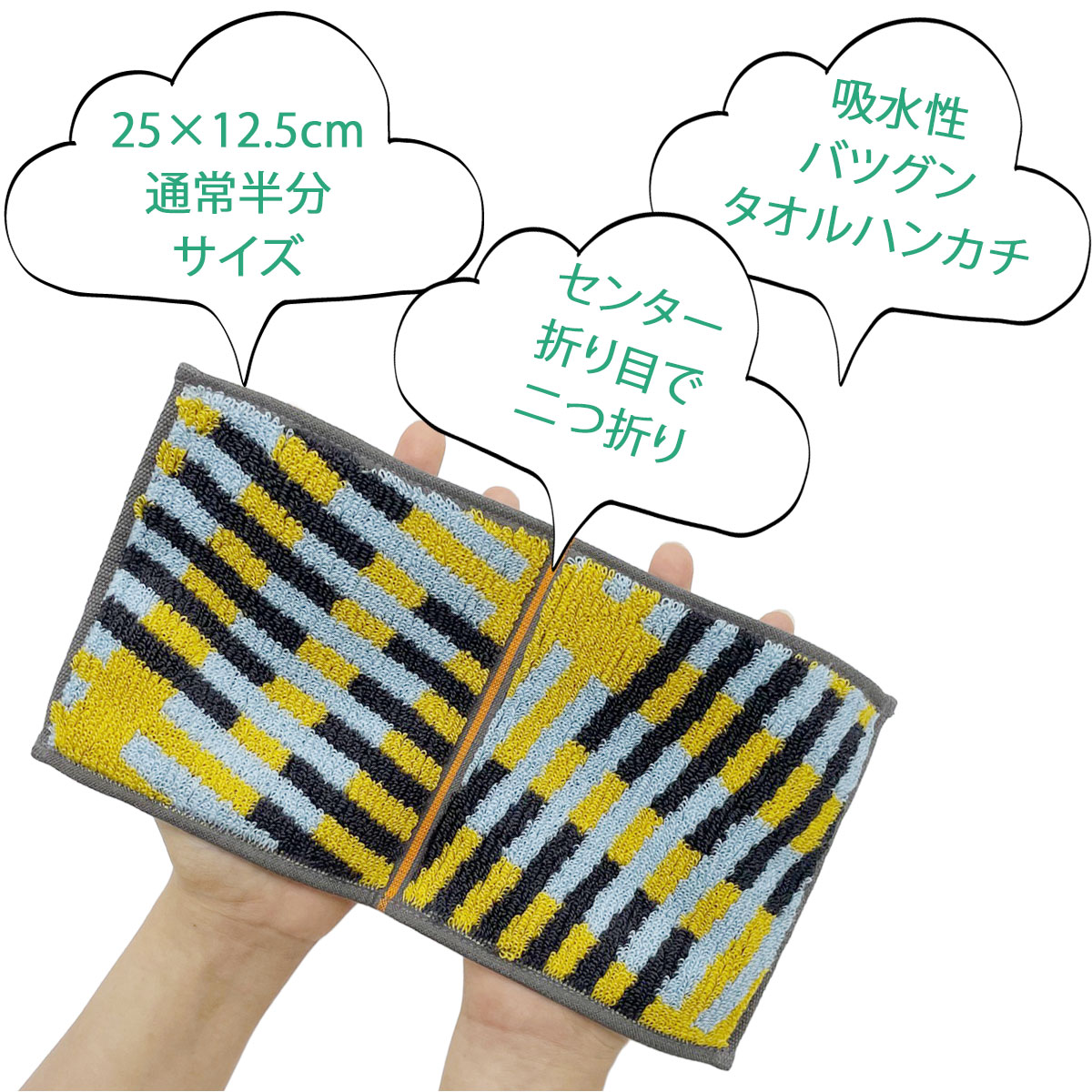 水分をしっかり吸い上げ、優しい肌触りの二つ折りハンカチ3枚セットです。