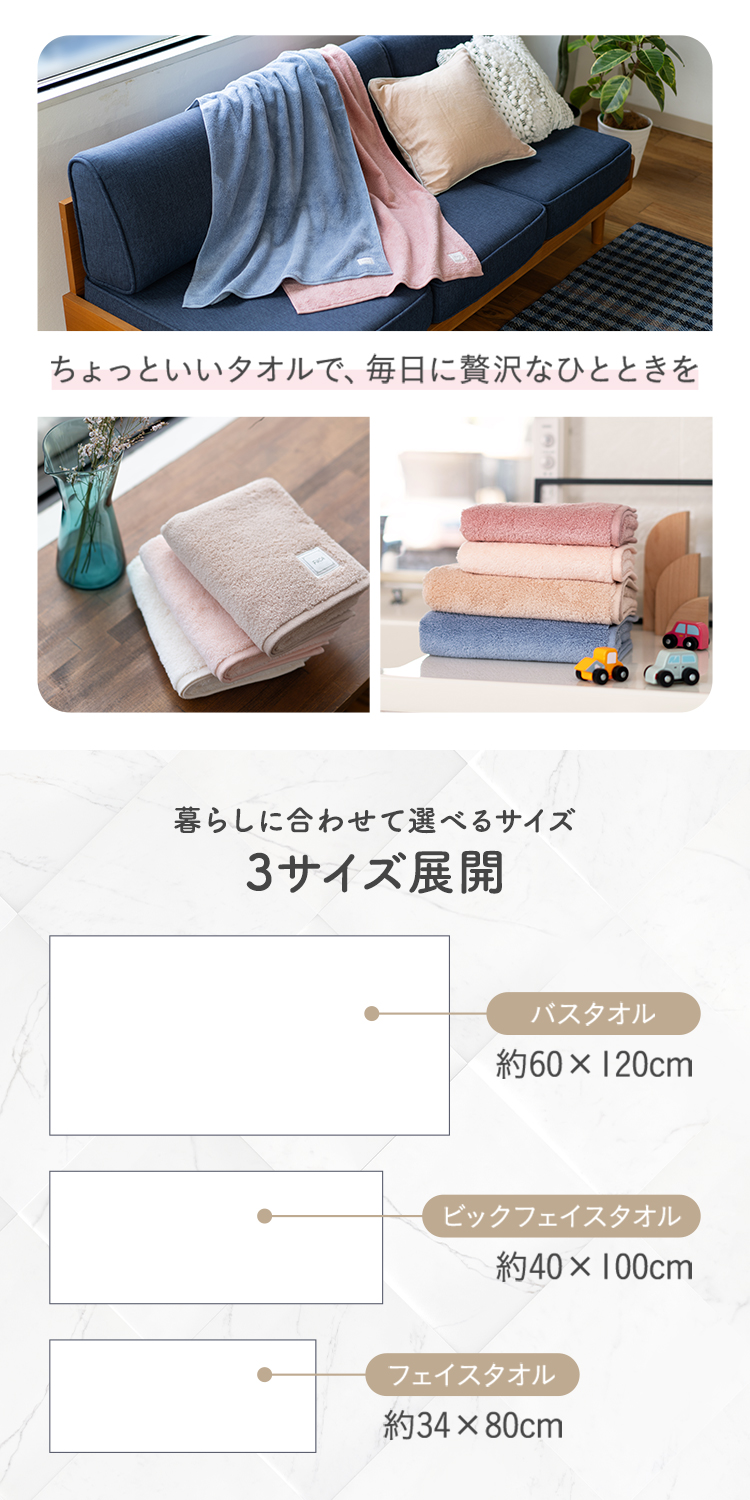 心地よいボリューム感とふわふわした肌触りのやわらかタオル。