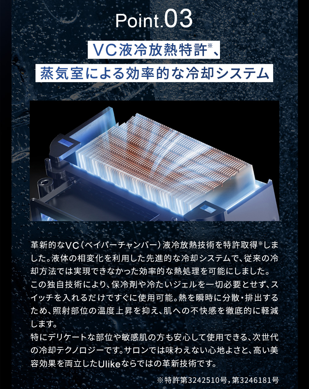 照射面と冷却面が一体化することで、照射していない時も継続的に冷却可能に。また、3つの冷却プロセスが途切れなく作動し、照射前から照射後まで継続した温度管理を実現。より効果的な熱コントロールにより、照射面温度を16℃*2までにキープ。こだわり抜いた「サファイヤ冷感技術」がケア中の快適さを最後までサポートします。