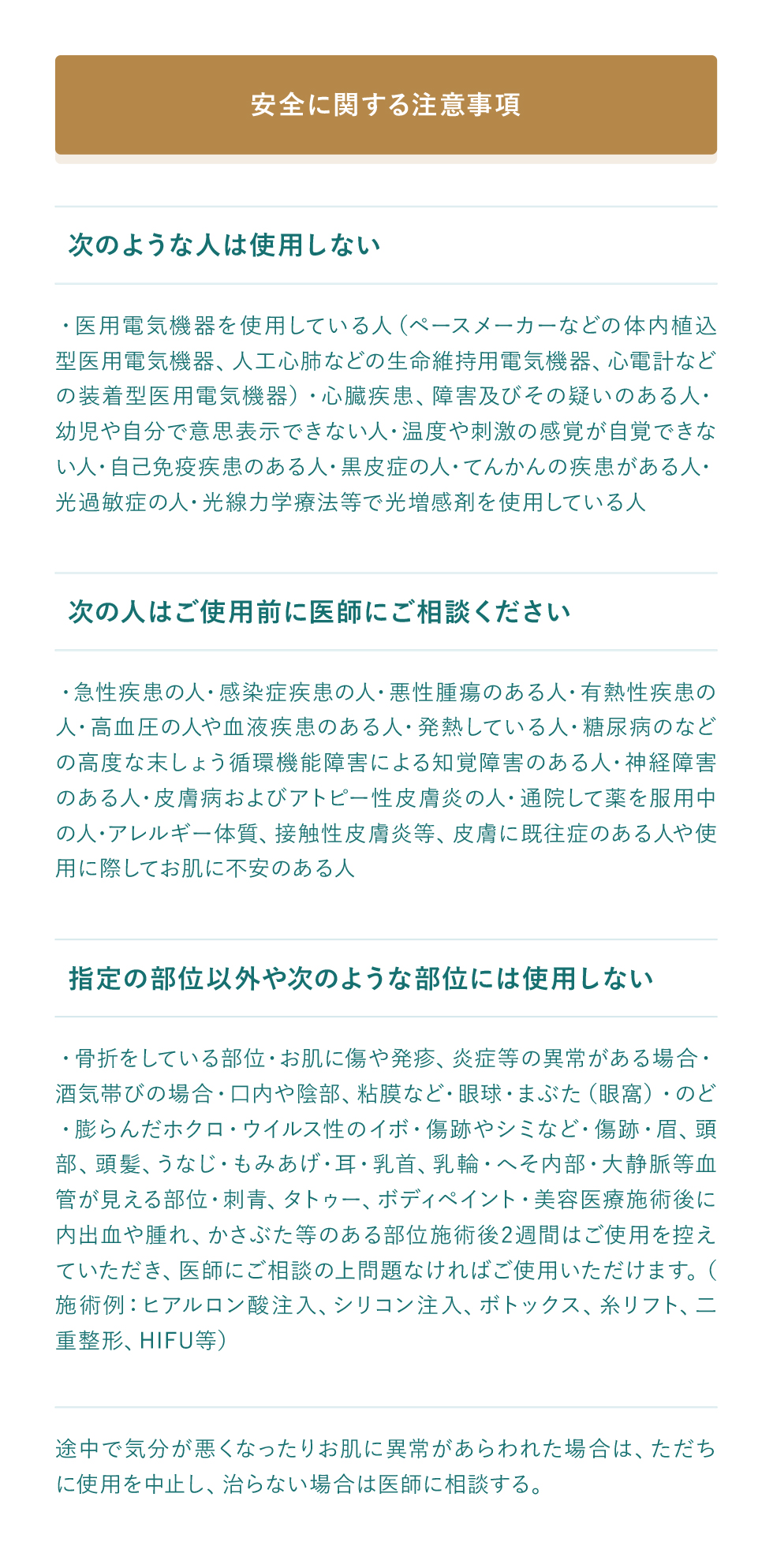 ・心臓疾患、障害及びその疑いのある人 ・温度や刺激の感覚が自覚できない人 ・妊娠初期から出産直後までの人