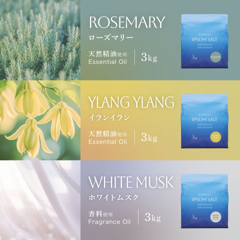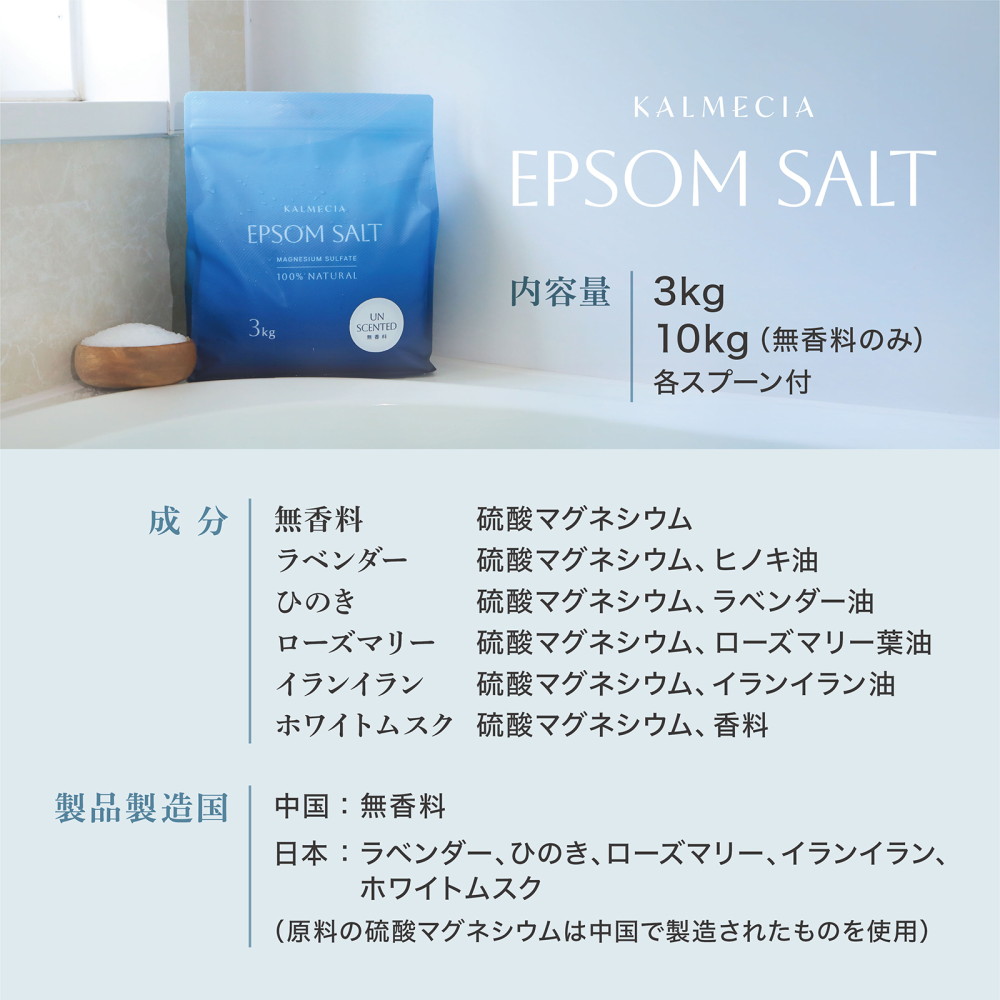KALMECIA エプソムソルト 入浴剤 3kg バスソルト ラベンダー ひのき ローズマリー ホワイトムスク 硫酸マグネシウム 追い炊き対応 計量スプーン付き 大容量 爆買