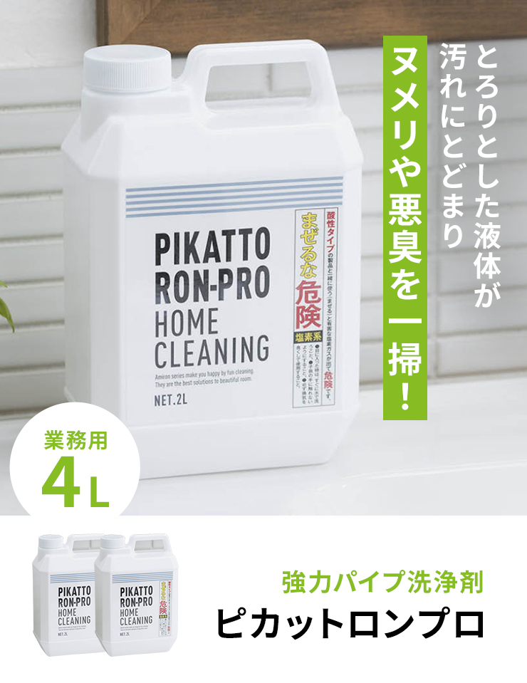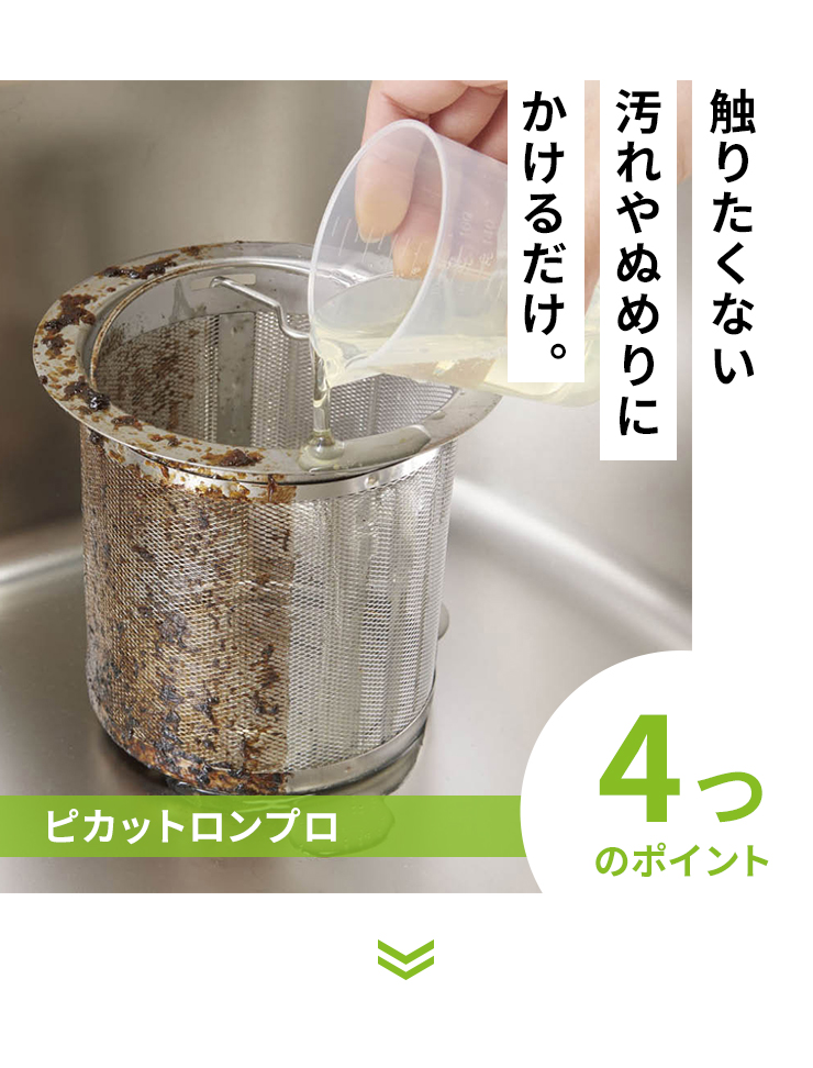 「ヌメリや悪臭を一掃!ピカットロンプロ」ドロッとした液で排水溝やパイプのヌメリ、カビに効く。ゴシゴシこすらなくてもみるみる分解。希釈してスプレーすればタイルの目地にも!