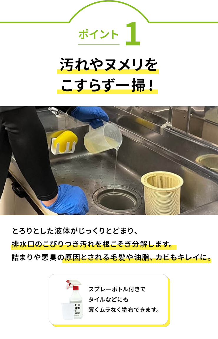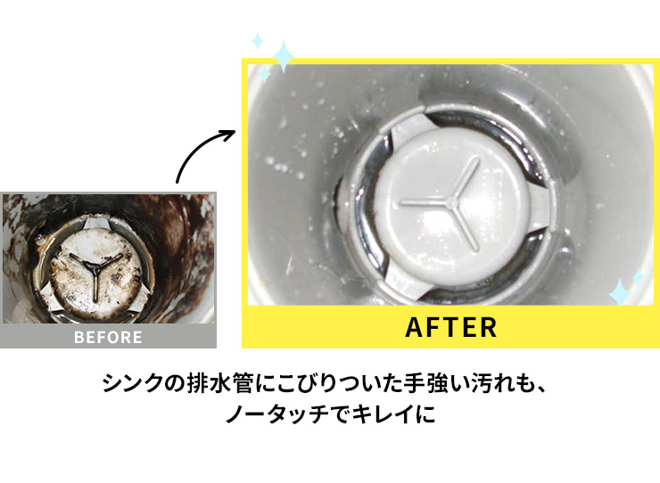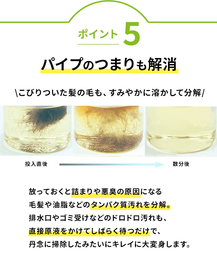 放っておくと詰まりや悪臭の原因になる毛髪や油脂などのタンパク質汚れを分解。排水溝やゴミ受けなどのドロドロ汚れも、直接原液をかけてしばらく待つだけで、丹念に掃除したみたいにキレイに大変身します。