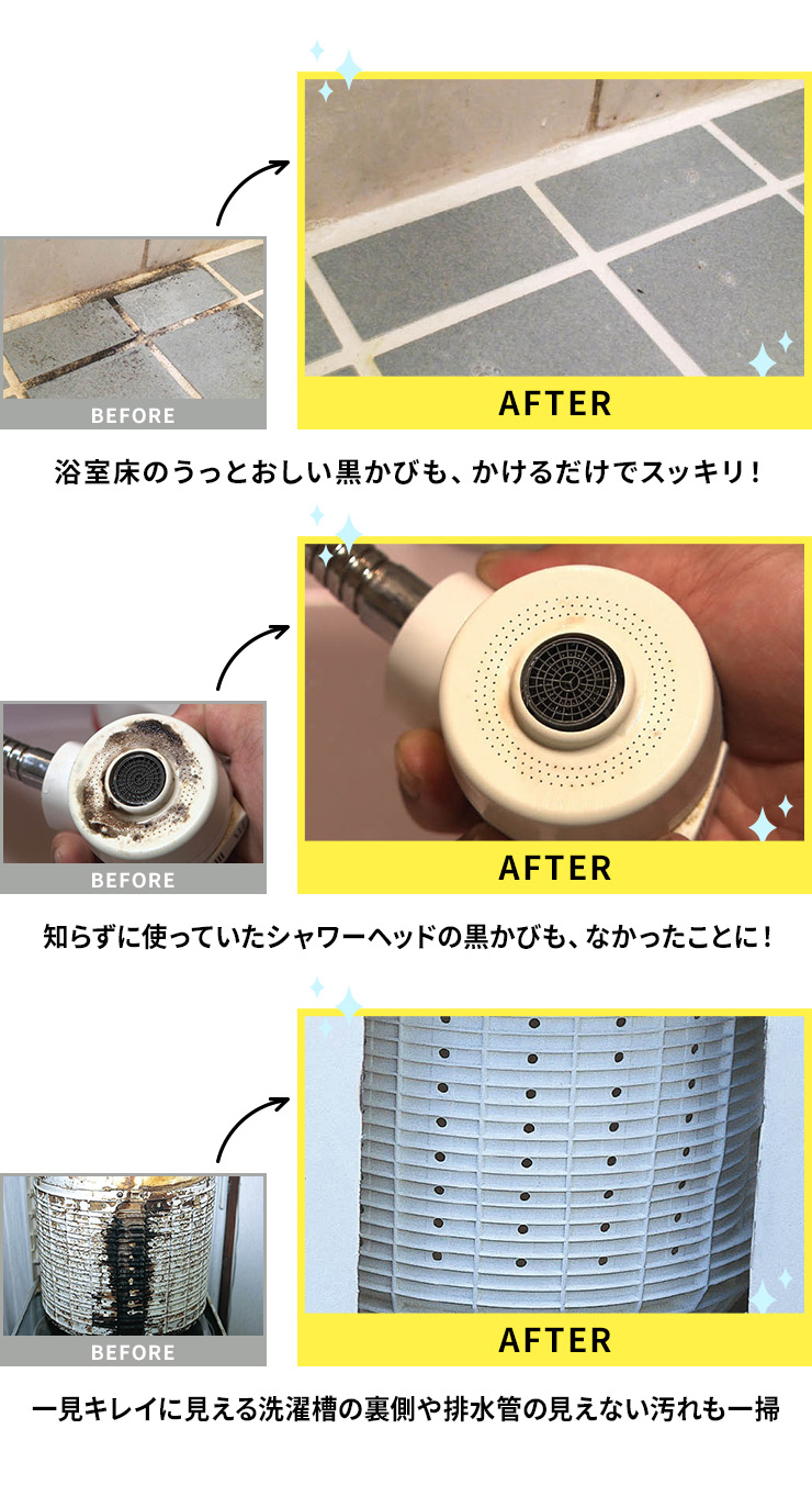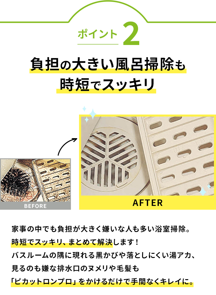 浴室の隅に現れる黒かびや落としにくい湯アカ、見るのも嫌な排水溝のヌメリや毛髪も「ピカットロンプロ」をかけるだけで手間なくキレイに。洗濯物のニオイの元になる洗濯槽の見えない汚れも強力に除去します。