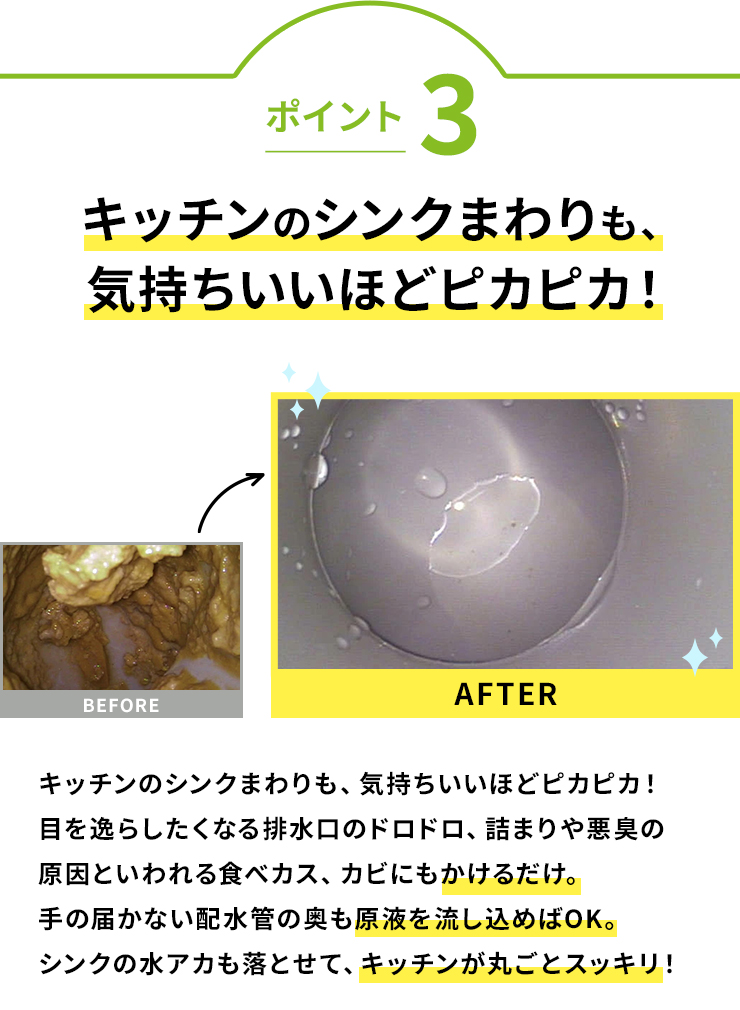 目を逸らしたくなる排水口のドロドロ、詰まりや悪臭の原因といわれる食べカス、かびにもかけるだけ。手の届かない配水管の奥も原液を流し込めばOK。シンクの水アカも落とせて、キッチンが丸ごとスッキリ!