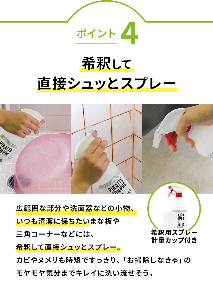 広範囲な部分や洗面器などの小物、いつも清潔に保ちたいまな板や三角コーナーなどには、希釈して直接シュッとスプレー。かびやヌメリも時短ですっきり、「お掃除しなきゃ」のモヤモヤ気分までキレイに洗い流せそう。