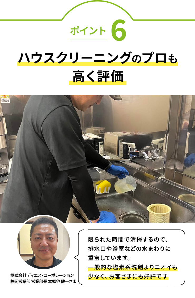 株式会社ディエス・コーポレーション 静岡営業部 営業部長 本郷谷 健一さま「限られた時間で清掃するので、排水口や浴室などの水まわりに重宝しています。一般的な塩素系洗剤よりニオイも少なく、お客さまにも好評です」
