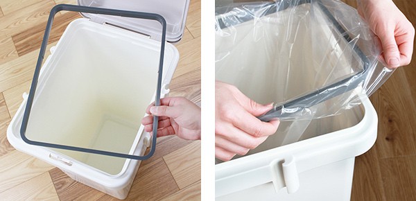 ゴミ袋を袋止めにセットすれば見た目にも美しく、袋がずれにくくなります。ペール内にスッポリゴミ袋が入り込んでしまわないので、ゴミの挿入がしやすい構造です。