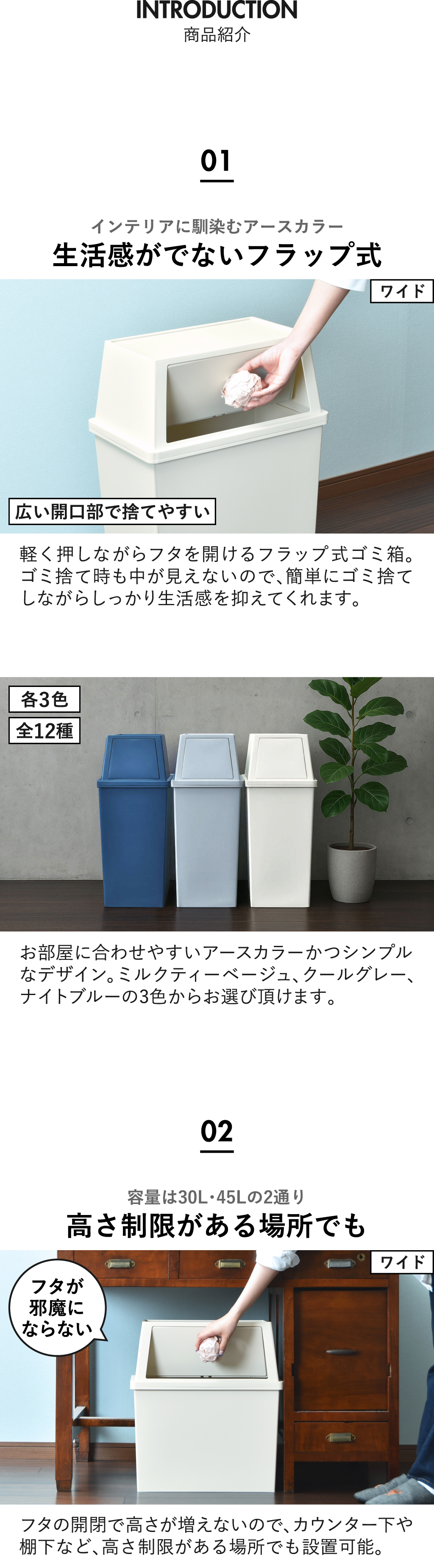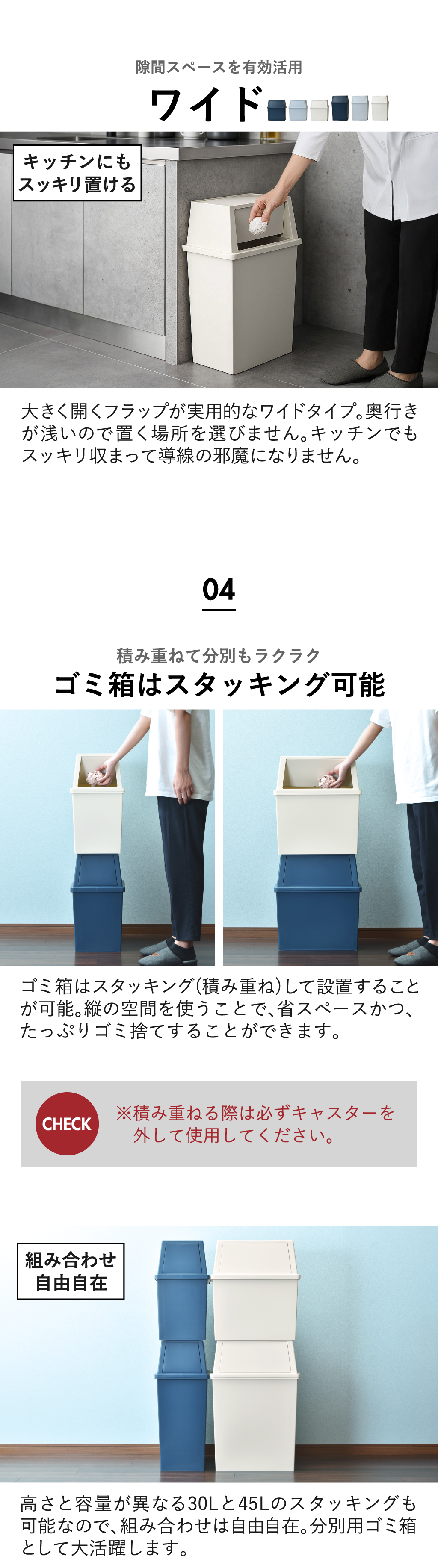 シンプルで機能的な積み重ねゴミ箱。45Lと大容量なので、キッチンの分別用ゴミ箱としても活躍してくれます。幅が約28cmのスリムタイプと約45cmのワイドタイプの2種類からお選びいただけます。フタ部分を軽く押したら開く「フラップ」仕様になっているので、ゴミ捨て時も中のゴミが見えません。また、高さを気にすることなくゴミ捨てできるので、カウンター下や棚下など、デッドスペースになりがちな空間も無駄なく活用できます。
