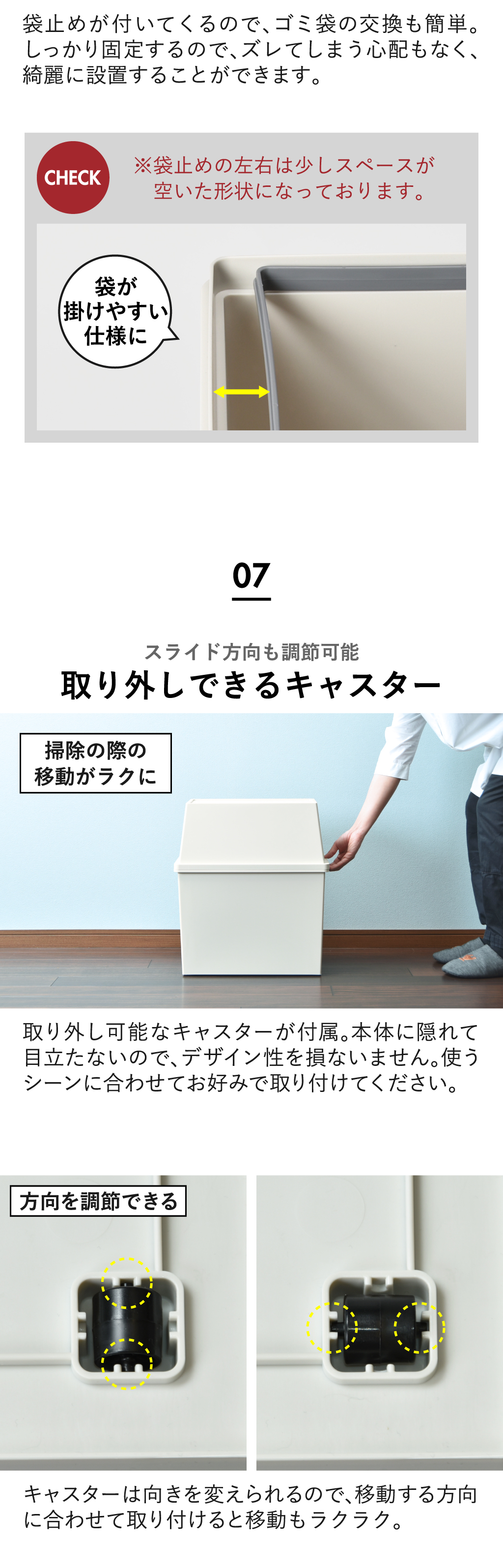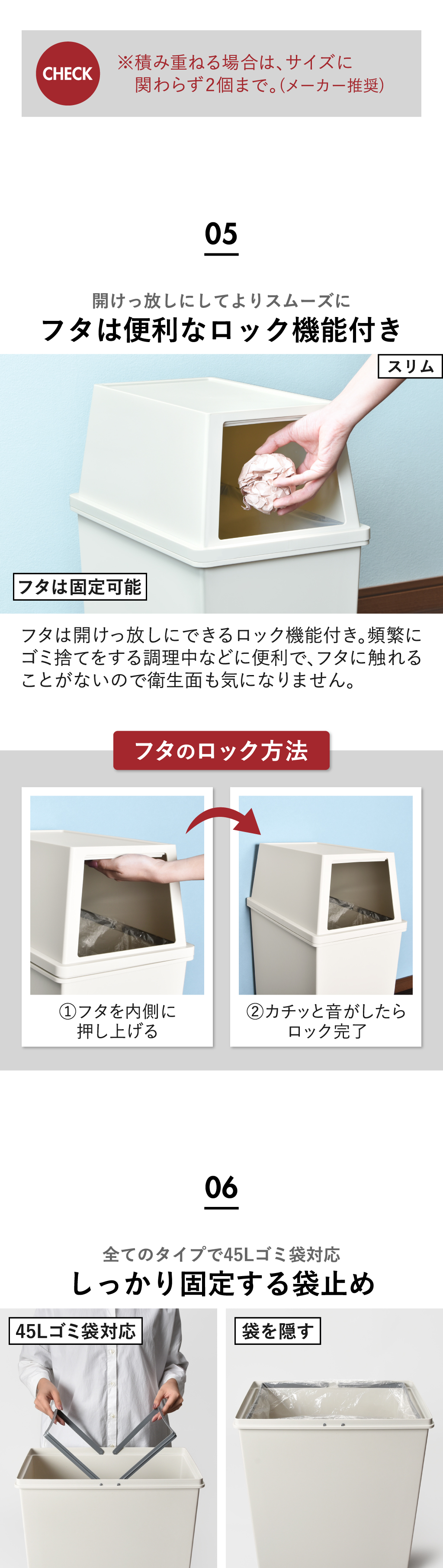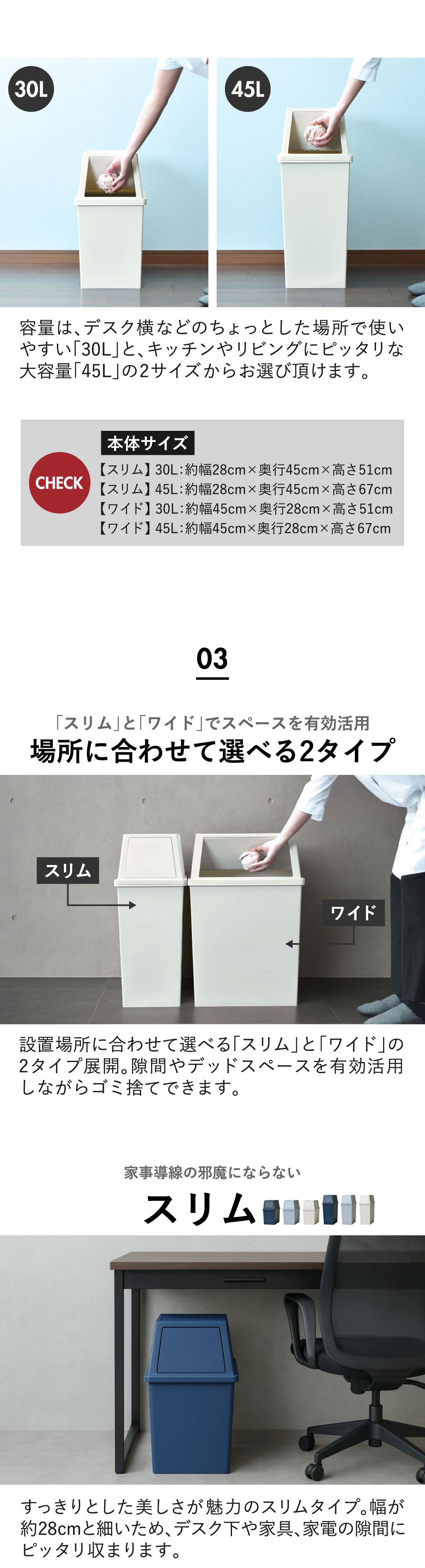 全ての種類で45リットルゴミ袋に対応。