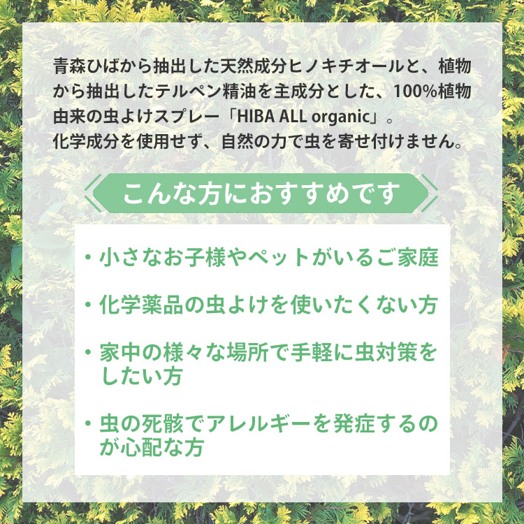 青森ひばから抽出した天然成分ヒノキチオールと、植物から抽出したテルペン精油を主成分とした、100%植物由来の虫よけスプレー「HIBA ALL organic」。化学合成成分を一切使用せず、自然の力で虫を寄せ付けません。