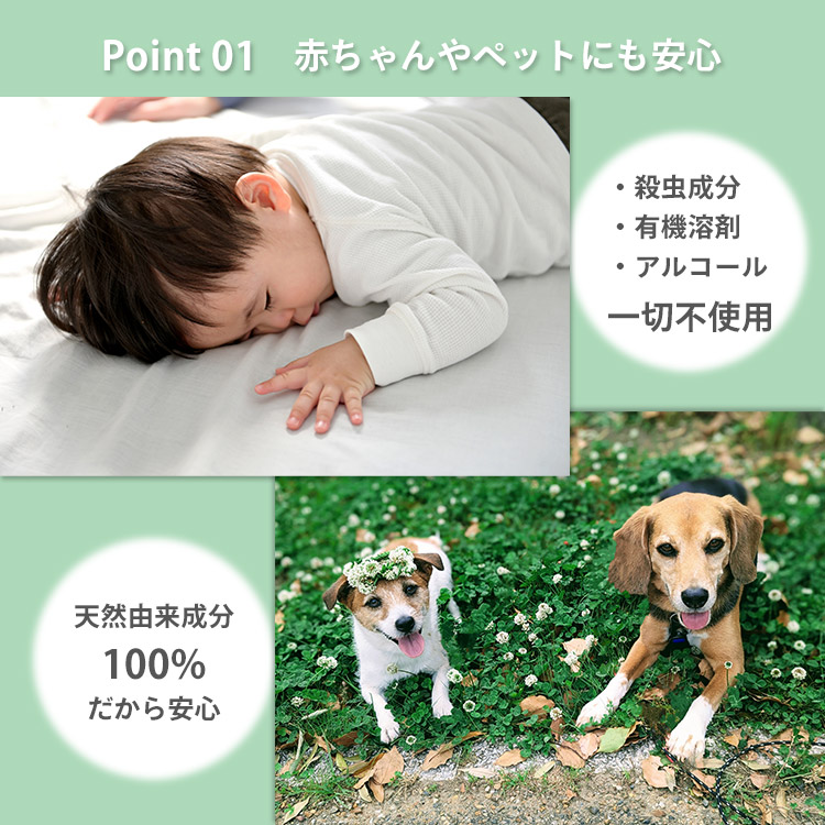 ・赤ちゃんやペットにも安心:殺虫成分・有機溶剤・アルコールは一切不使用。天然由来成分100%なので、安心してご使用いただけます。